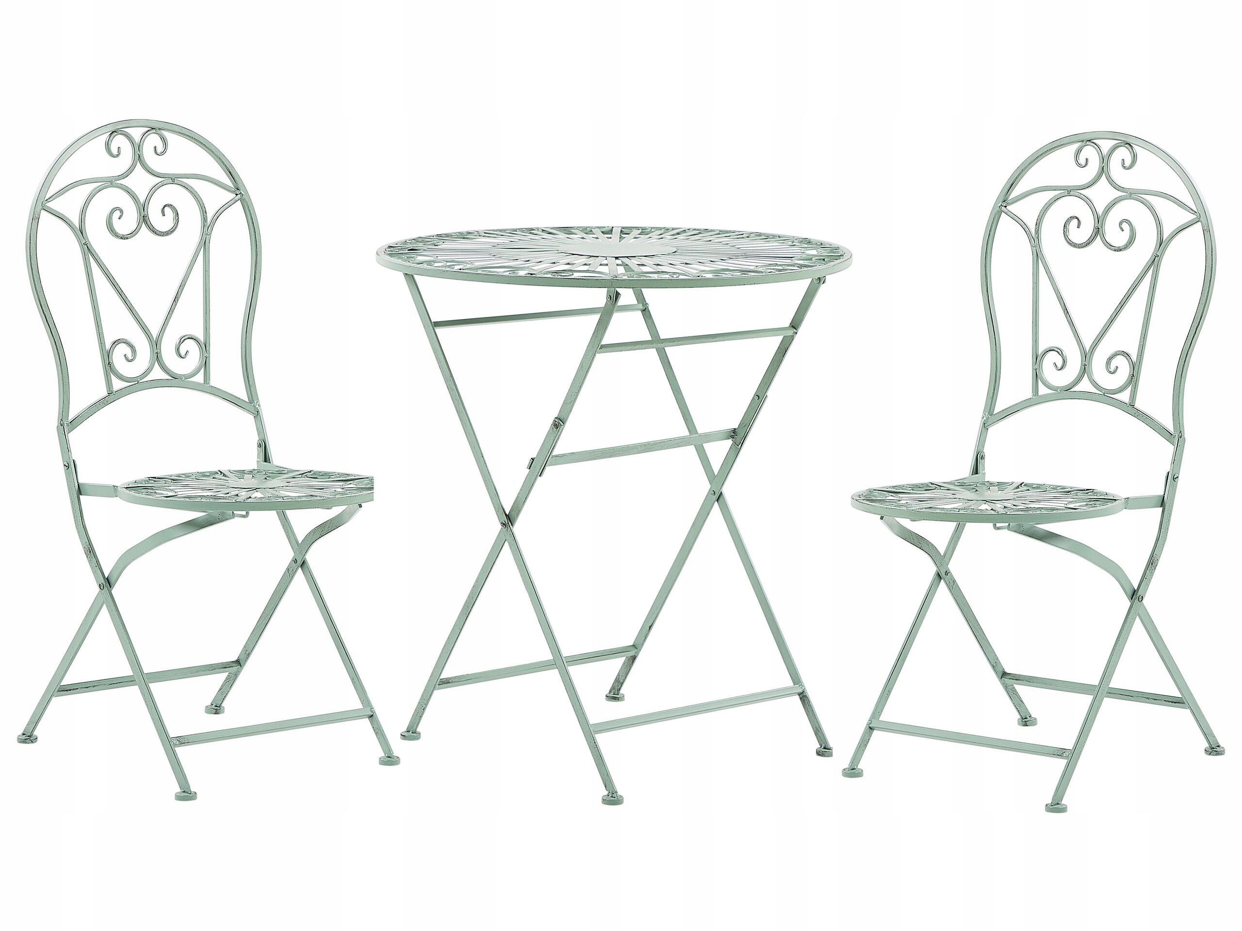 Надзвичайно романтична атмосфера просто неба. Цей складний стіл і стільці зеленого кольору стануть ідеальним вибором для будь-якого невеликого балкона чи тераси, забезпечуючи чарівне місце для відпочинку. Метал, пофарбований порошковою фарбою, злегка зістарений, тому чудово підійде до балкону, оформленого у вінтажному стилі та усіяного квітами, де можна провести ранок за чашкою кави.