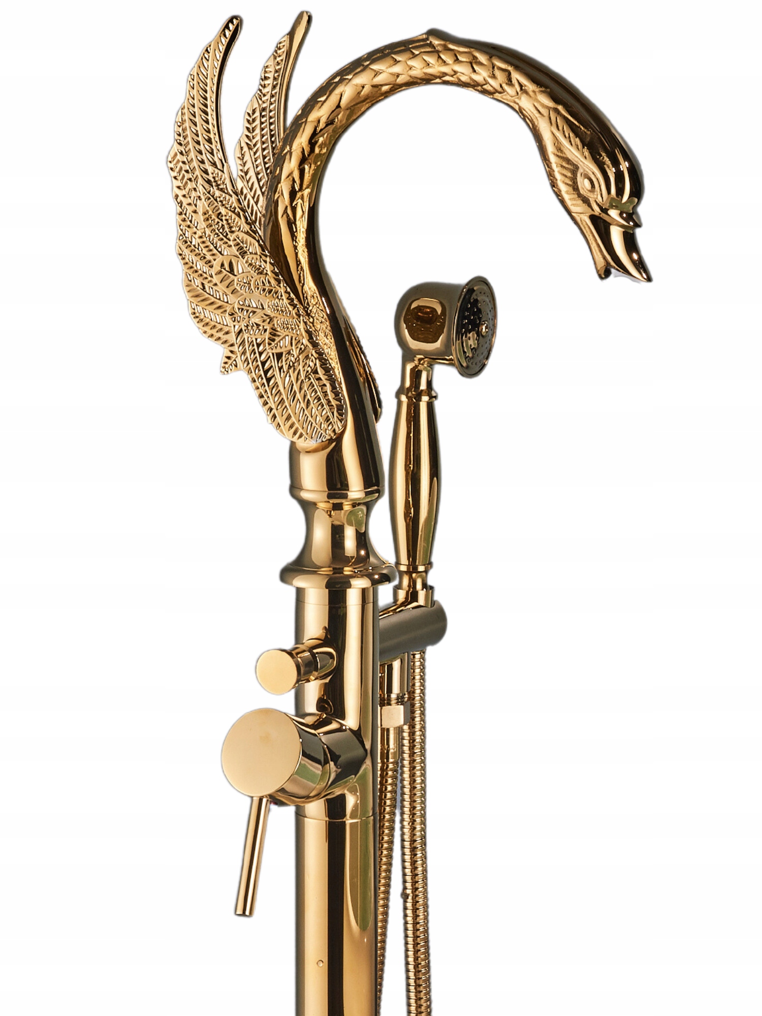 Окремий змішувач для ванни золотого кольору з виливом у формі лебедя – елегантне рішення, яке вирізнить будь-яку ванну кімнату. Такий змішувач є не тільки функціональним елементом сантехніки, а й прикрасою, яка додасть їй елегантності та престижу.