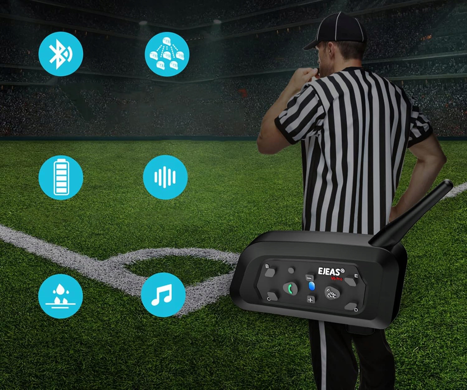 Професійний домофон для суддів: за допомогою оптимізованої мікросхеми Qualcomm Bluetooth 5.1 EJEAS V6C може досягати швидкого сполучення та підтримувати низьке енергоспоживання. Він підтримує з’єднання до 6 осіб, домофон у режимі реального часу для 2 осіб, а діапазон розмови може досягати 800 м.