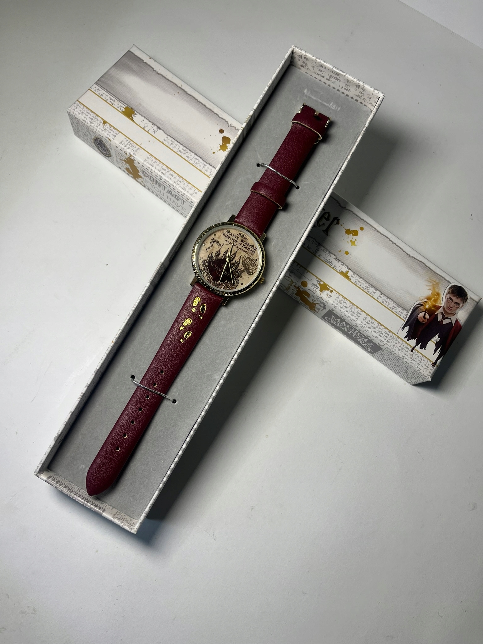 Жіночий аналоговий годинник з ремінцем із пряжкою. Циферблат, прикрашений позолоченою окантовкою та мотивом карти мародерів. З бордовим шкіряним ремінцем і позолоченою пряжкою. Ліцензований продукт Ширина ремінця: прибл. 15 мм Розмір циферблата: 34 мм Вага продукту: 152 г