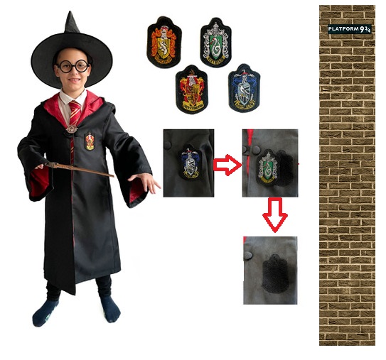 Наш набір включає 4 емблеми, прикріплені до накидки за допомогою липучок. Завдяки їм ваша дитина може бути не тільки Гаррі Поттером, а й учнем школи:
