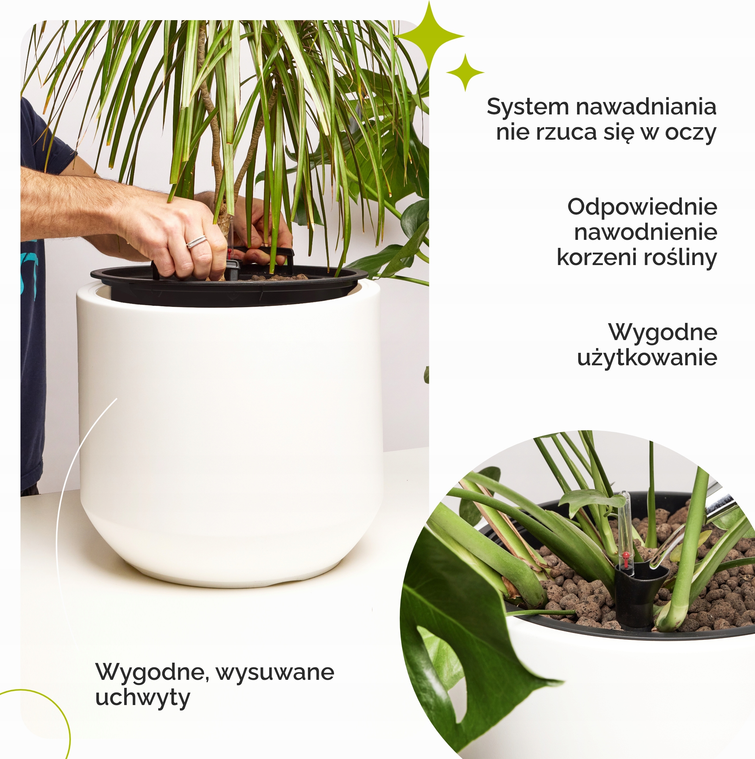 Сучасний вазон ідеально підходить для таких рослин, як пальмаабо монстера. Він не тільки функціональний, але й візуально привабливий, ідеальний як для саду, так і для домашнього інтер'єру. Його місткість гарантує достатньо місця для домашніх рослин, підтримуючи їх здоровий ріст і рясне цвітіння. Великий квітковий горщик Garronda, оснащений передовою системою автополиву та індикатором рівня води, що забезпечує рослинам оптимальні умови для росту. Система зрошення підтримує ґрунт постійно вологим, а індикатор рівня води дозволяє легко контролювати зволоження, що особливо корисно для рослин, яким потрібна постійна вологість ґрунту.