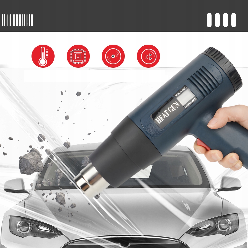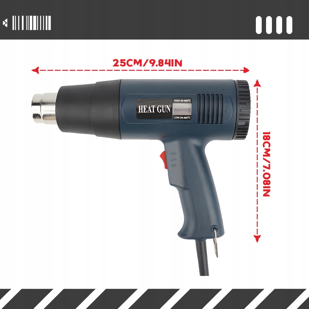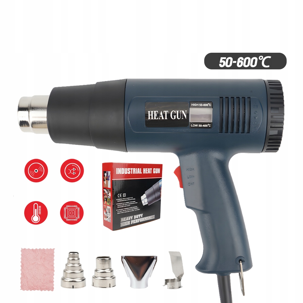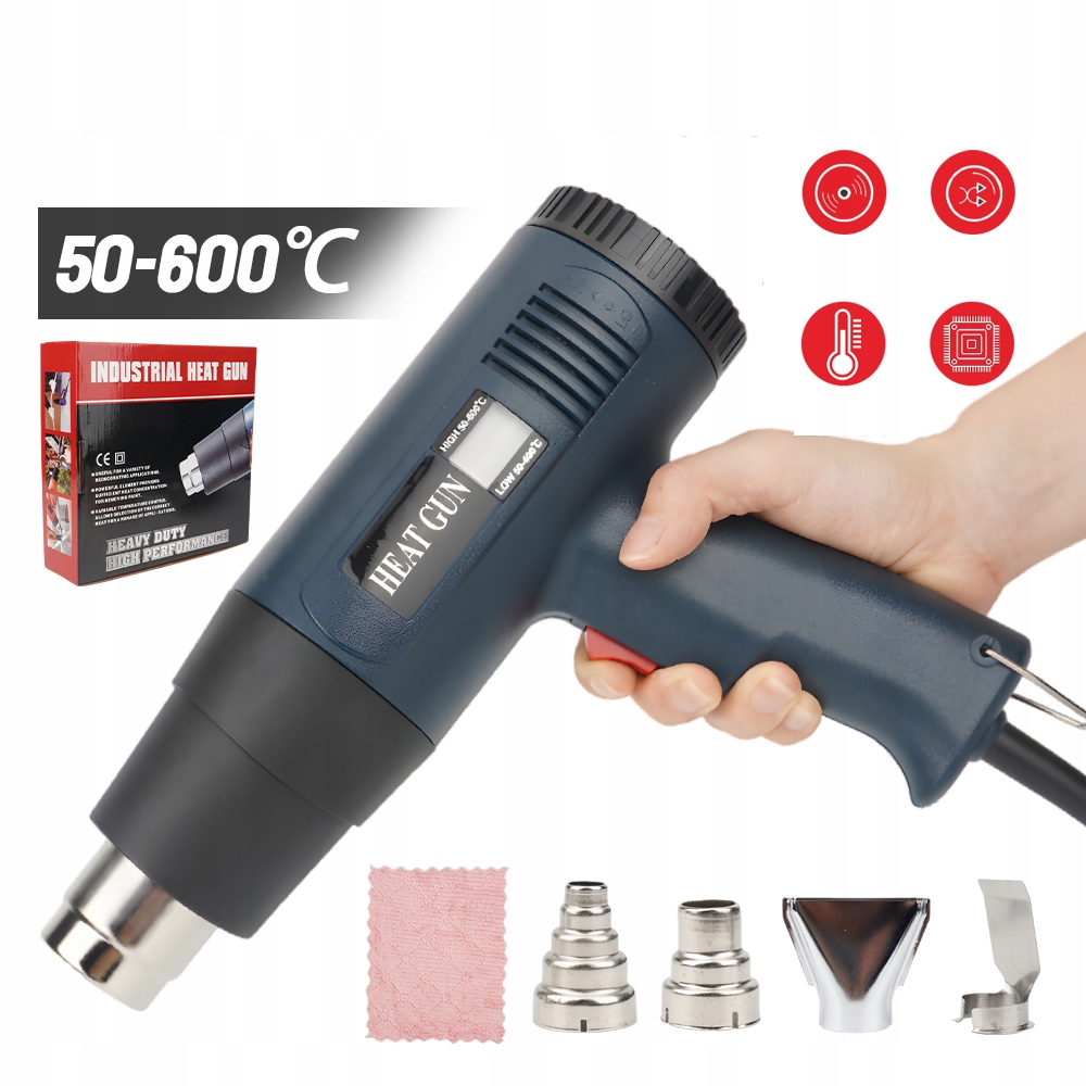 } 【【 Безпека】 Захист від гарячого повітря від перегріву забезпечує високу безпеку, оскільки пістолет на гарячому повітрі автоматично вимикається в надзвичайних ситуаціях. Тепловий запобіжник захищає повітрод Потужність 2000 Вт і нагріває до 300-600 літрів повітря в хвилину. Гарячий пістолет ідеально підходить для лущення, нагрівання, деформації та нагрівання різних матеріалів. Пластикові покриття та випуск повітря з нержавіючої сталі, які укладені в міцний корпус. Окислювальний дріт, вентилятор, слюда та повністю мідний двигун, стійкі до високої температури, корозії та тривалого життя. Пістолет з гарячим повітрям має науково ергономічну ручку, зручну ручку та забезпечує легку роботу. Лак для видалення фарби, обгортання краю, зйомки вікон та освіження пластику в транспортному засобі. Гарячий пістолет для лущення та зварювання фольги, зварювання пластмас, деформація, деформація, пайка, сушіння, відтавання, видалення фарби та багато інших.