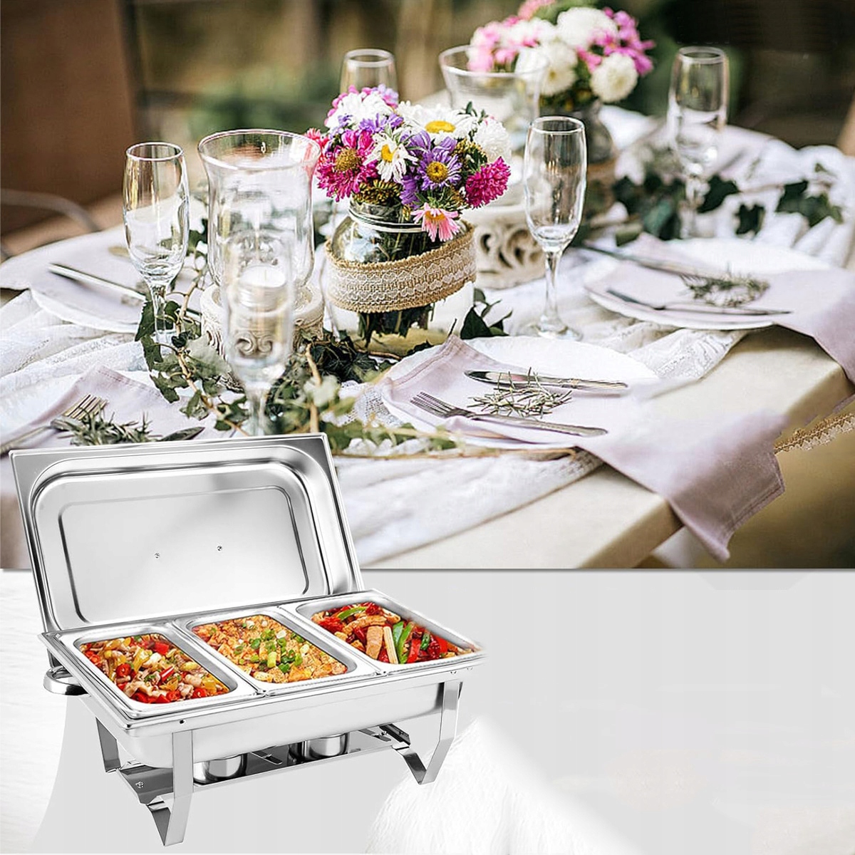 9-літровий набір контейнерів для підігріву їжі з нержавіючої сталі зі складними ніжками для фуршетів і вечірок (сріблястий, потрійна таця на вибір) ♨️♨️♨️