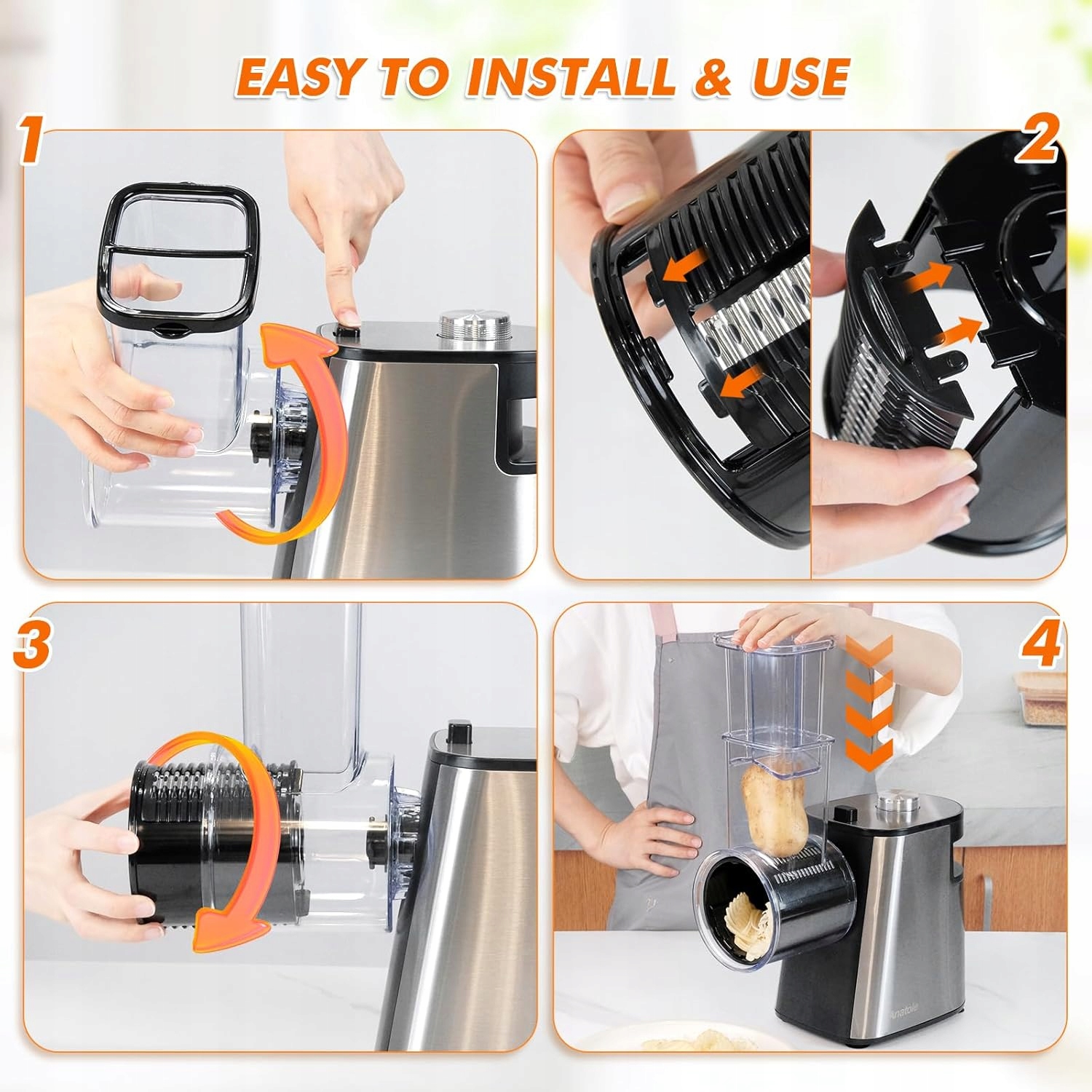 оснащені 5 лопатями (для тертя на грубі, для дрібно тертя, для рубання шматочків, для подрібнення та шліфування) цей багатофункціональний рослинний зріз ідеально підходить для різання сиру, картоплі, моркви, цибулі, кукучок, кабачків, плід, шоколаду та багато інших продуктів! Ви можете легко приготувати салати, супи, десерти і навіть чіпси.