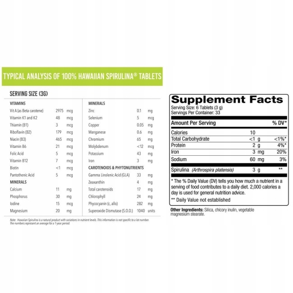 Гавайська спіруліна - це водорість, що характеризується вмістом багатьох мікроелементів, мінералів: заліза, магнію, калію, цинку, марганцю, фосфору і селену, а також вітамінів А, В, В12 і Е, як ненасичені кислоти жирні кислоти: лінолева та ліноленова та понад 20 амінокислот.