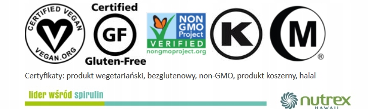 - гавайський Spirulina Pacifica має міжнародні сертифікати якості (в т.ч ISO9002 та сертифікати кошерності) та сертифікати безпеки використання,
