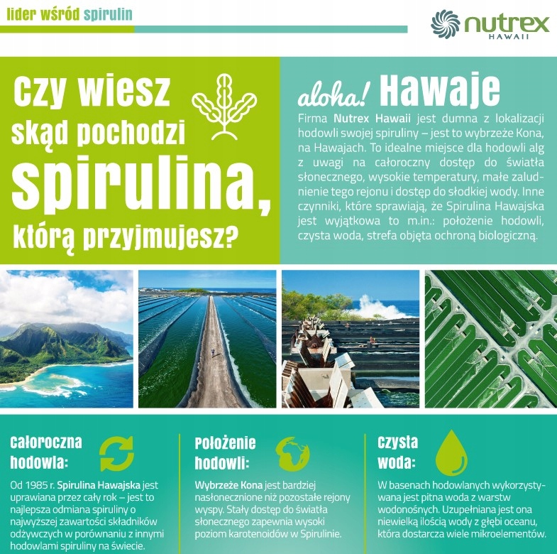 - Кайлуа-Кона на Гаваях має дуже сприятливі кліматичні та екологічні умови для виробництва спіруліни,