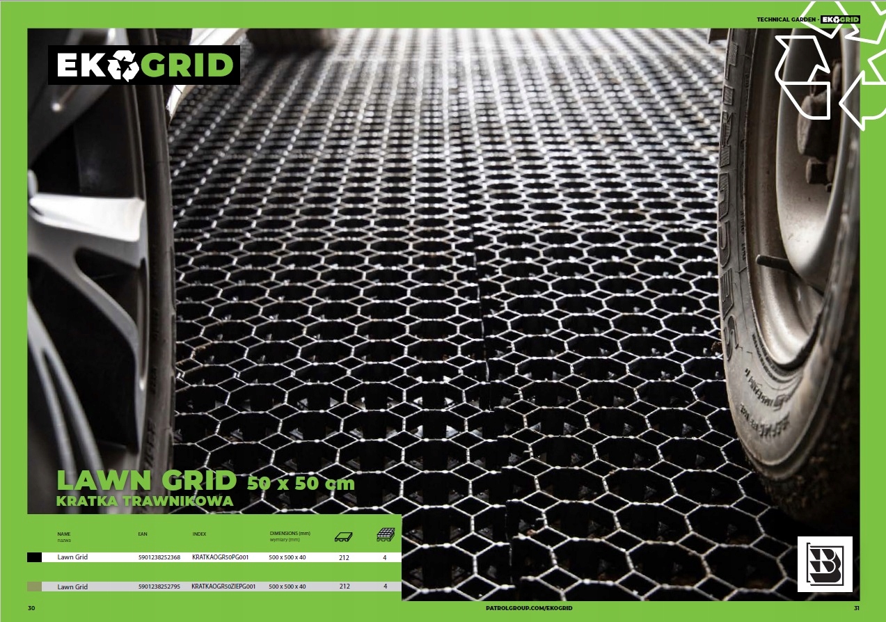 Сітка EKOGRID розміром 50 х 50 см дуже міцна і витримує тиск 1000 т, тому замінює бруківку або ажурну бетонну плиту.