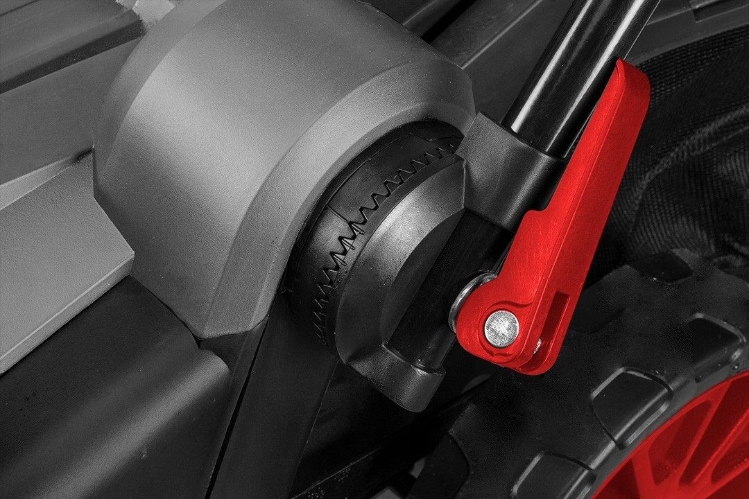 Спеціально профільована кришка кошика забезпечує оптимальний збір скошеної трави та великі задні колеса дозволяють легко маневрувати.