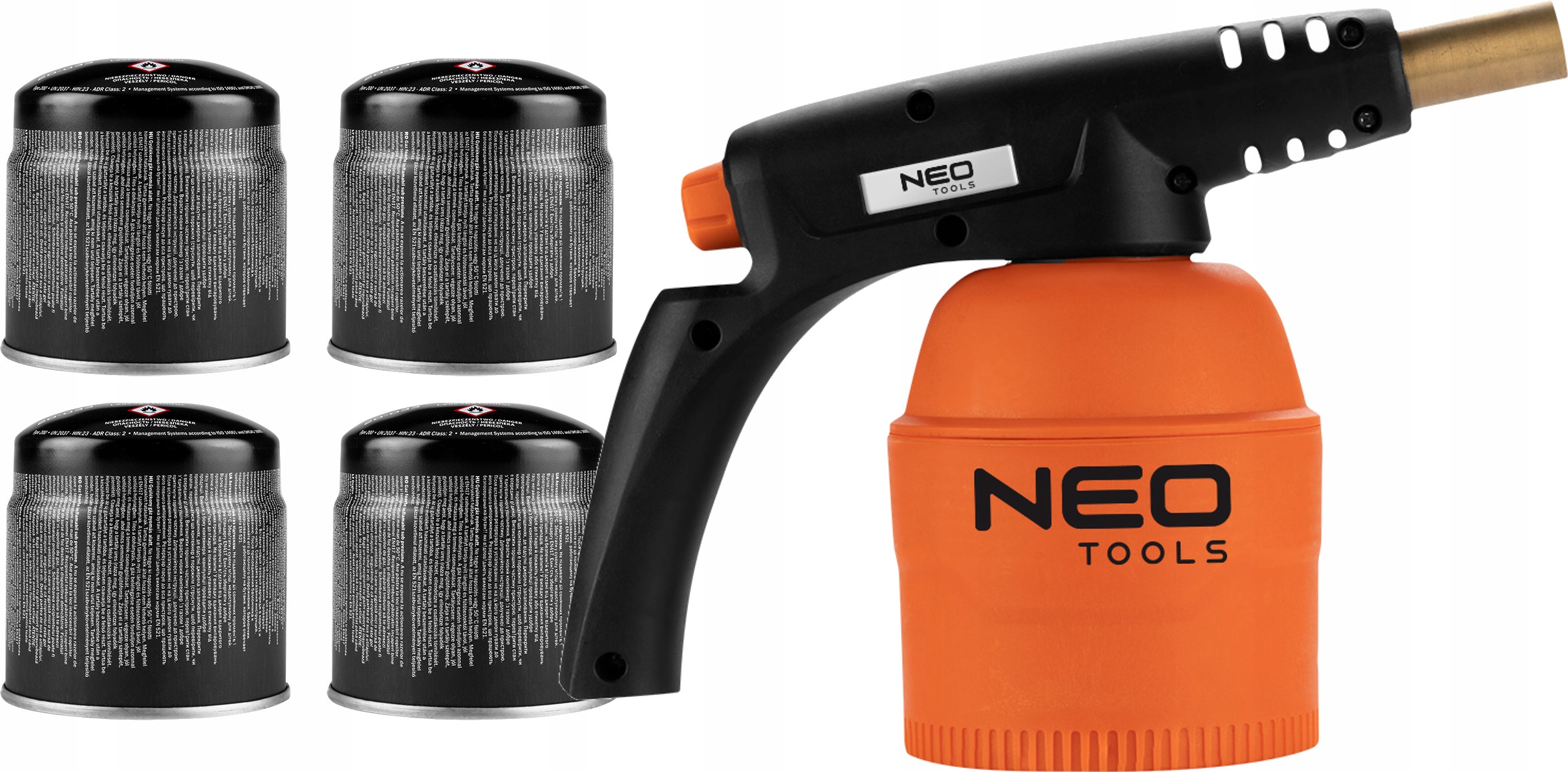 Паяльна лампа NEO виготовлена з пластику. У лампах використовуються патрони з пропан-бутаном 190 г. Температура нагріву 1350°C. Виріб має регульований розмір полум'я. Витрата газу 87г/год, потужність приладу 1,2кВт. Дозволяє паяти олово, алюміній, срібло, формувати або згинати труби, пластини тощо. Крім того, ви можете використовувати лампу для зняття лаку, розпалювання решітки, відкручування гвинтів і розморожування труб. 4 газових картриджа NEO бутан (арт. № 20-033) вагою 190 г. Унікальна система блокування відтоку газу підвищує безпеку використання. Картридж для універсального використання, наприклад, у пажарних лампах або кемпінгових печах. Торгова марка NEO адресована професіоналам.