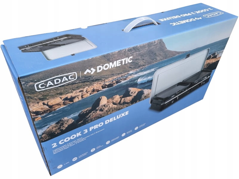 Двоконфоркова газова плита 2 Cook 3 Pro Deluxe працює при тиску газу 30 мбар. Це остання модель пристрою, створена у співпраці двох авторитетних компаній: CADAC і Dometic. Ця піч ідеально підходить для кемпінгу або каравану. Він легкий і зручний. Плита з двома підставками для каструль і двома керамічними пластинами для гриля (1 x гладка і 1 x ребриста). За допомогою цього приладу можна готувати і готувати на грилі одночасно. 2-Cook легко запалюється завдяки автоматичному п'єзорозпалюванню. Пристрій стійкий, має нековзні гумові ніжки і в комплекті є практична сумка для транспортування та зберігання. Він вміщує каструлі діаметром 25 см, що дозволяє легко кип’ятити воду чи розігрівати суп.