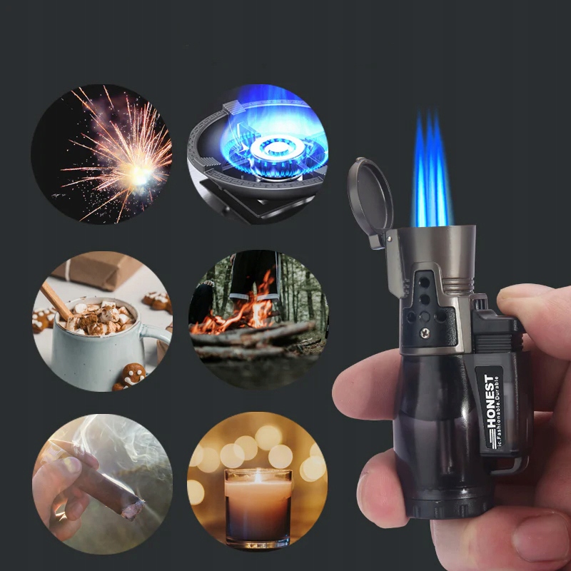 Високоякісний газовий пальник з трьома форсунками від HONEST. Оснащений клапаном заповнення газом і плавним регулюванням потужності полум'я.