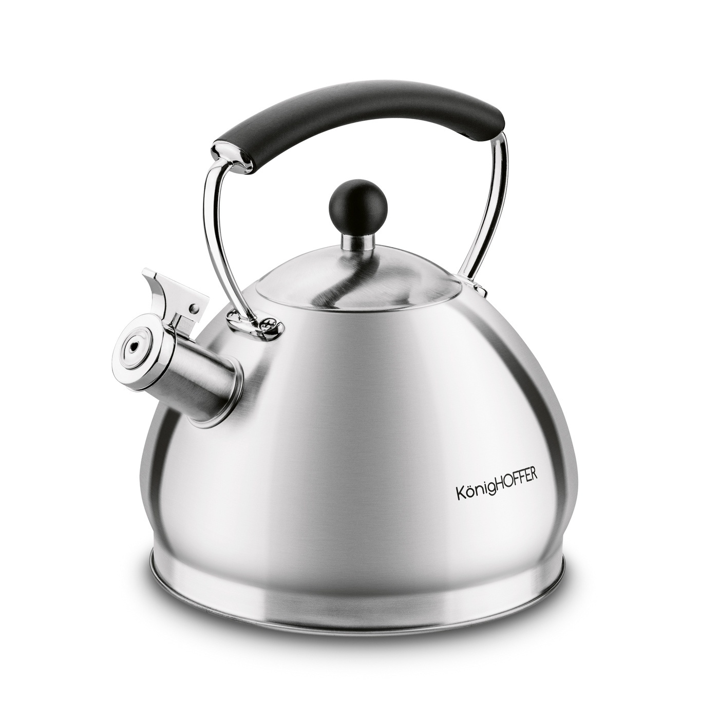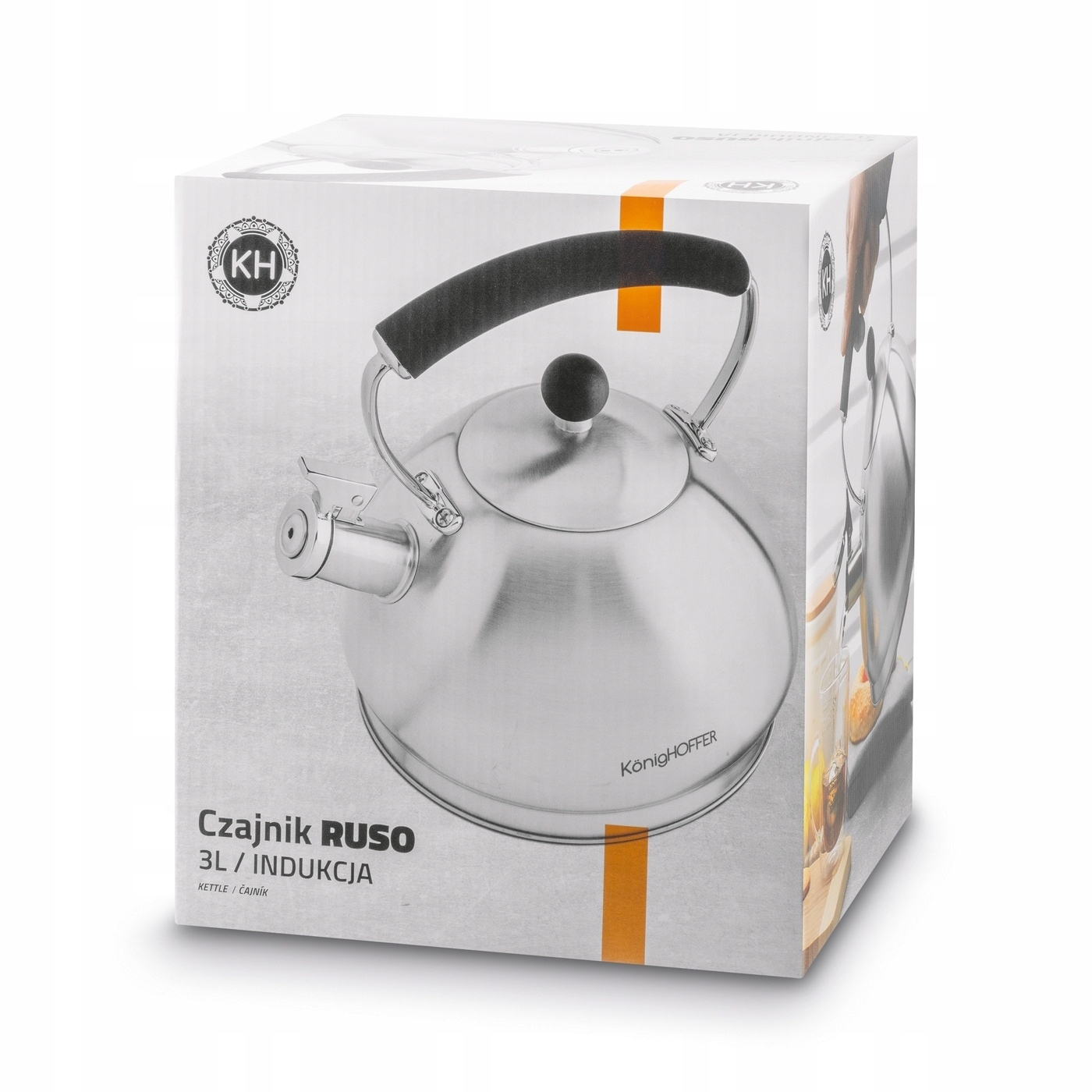 Сріблястий чайник Konighoffer Ruso 3 л з атласної нержавіючої сталі чудово виглядає на плиті, тож ви отримуєте стильне кухонне обладнання. Знімна кришка і відкидний свисток полегшують приготування напоїв і забезпечують безпеку. Нержавіюча сталь забезпечує чайнику довговічність і стійкість, а також захищає здоров'я ваших близьких (не впливає на властивості води). Працює на індукційних, газових, керамічних та електричних плитах. Міцна ручка виготовлена з матеріалу, що не ковзає і не нагрівається. Щоб наповнити чашки окропом, достатньо однієї руки. Класична і стримана форма корпусу урізноманітнить Вашу кухонну техніку. Завжди вчасно почуєш, що вода кипить, а свисток не впаде на плиту і не розтане.