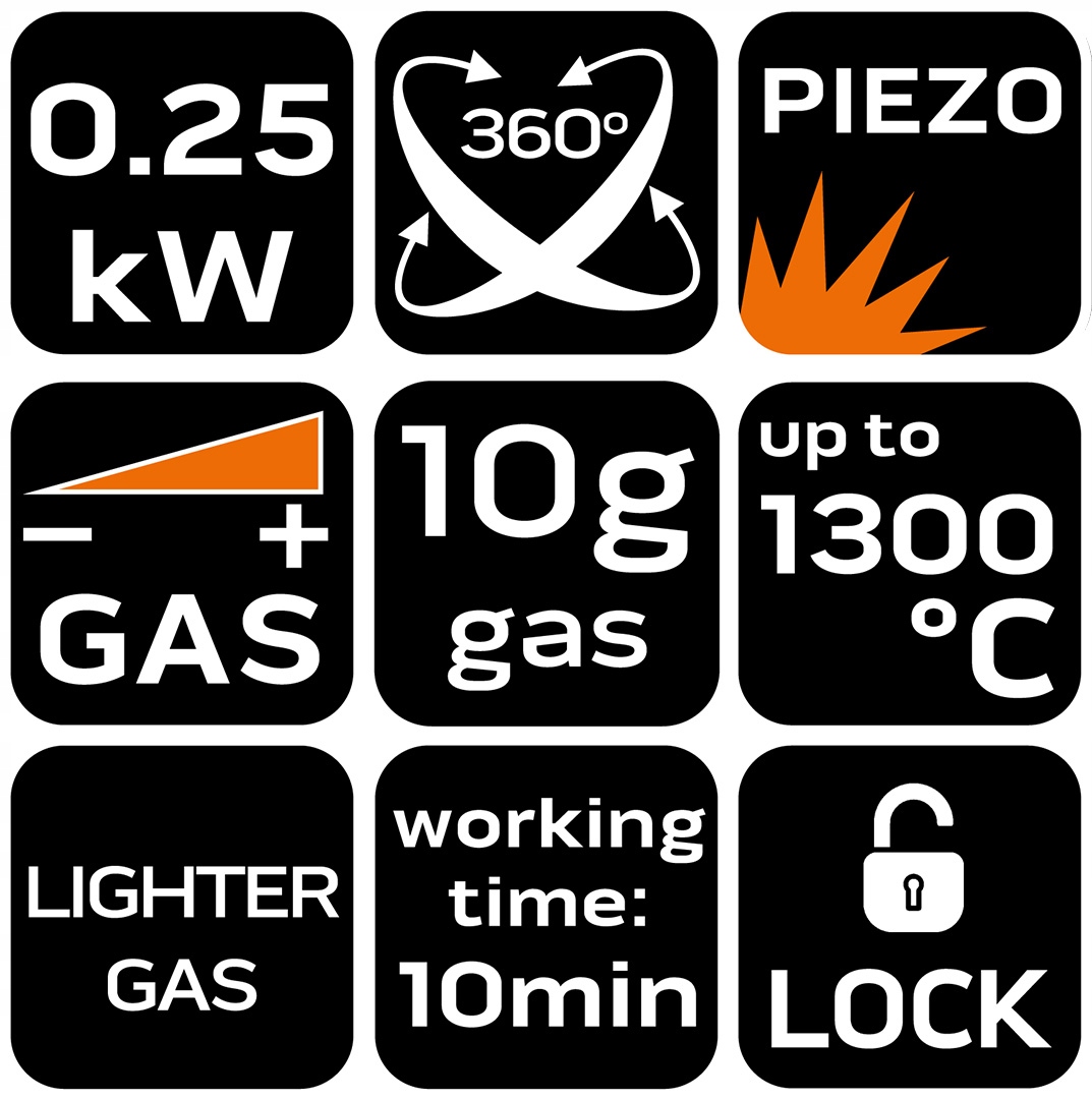 ⚙ Neo Tools 19-908 Газ Mikropalnik пропонує потужність 0,25 кВт , що дозволяє швидко та ефективно нагрівати, паякувати або засмагати різні матеріали. вимогливі завдання