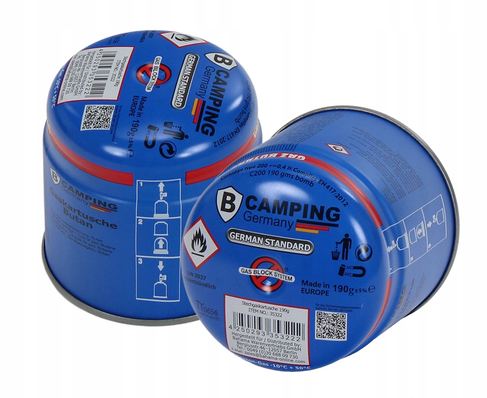 2 картриджа з бутаном вагою 190 г. Унікальна система блокування відтоку газу підвищує безпеку використання. Картридж для універсального використання, наприклад, у пажарних лампах або кемпінгових печах.