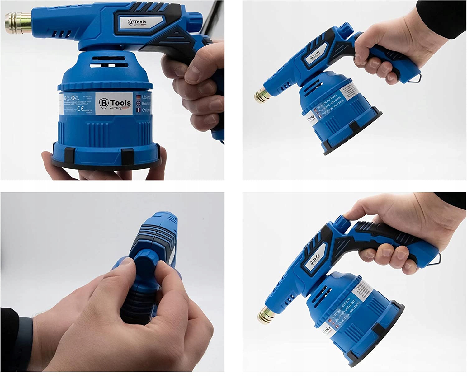 Паяльна лампа B-Tools Germany виготовлена з міцного матеріалу. У лампах використовуються патрони з бутаном 190 г. Температура нагріву 1200°C. Виріб має регульований розмір полум'я. Витрата газу 87г/год, потужність приладу 1,35кВт. Дозволяє паяти олово, алюміній, срібло, формувати або згинати труби, пластини тощо. Крім того, за допомогою лампи можна зняти лак, розпалити барбекю, відкрутити гвинти та розморозити труби.