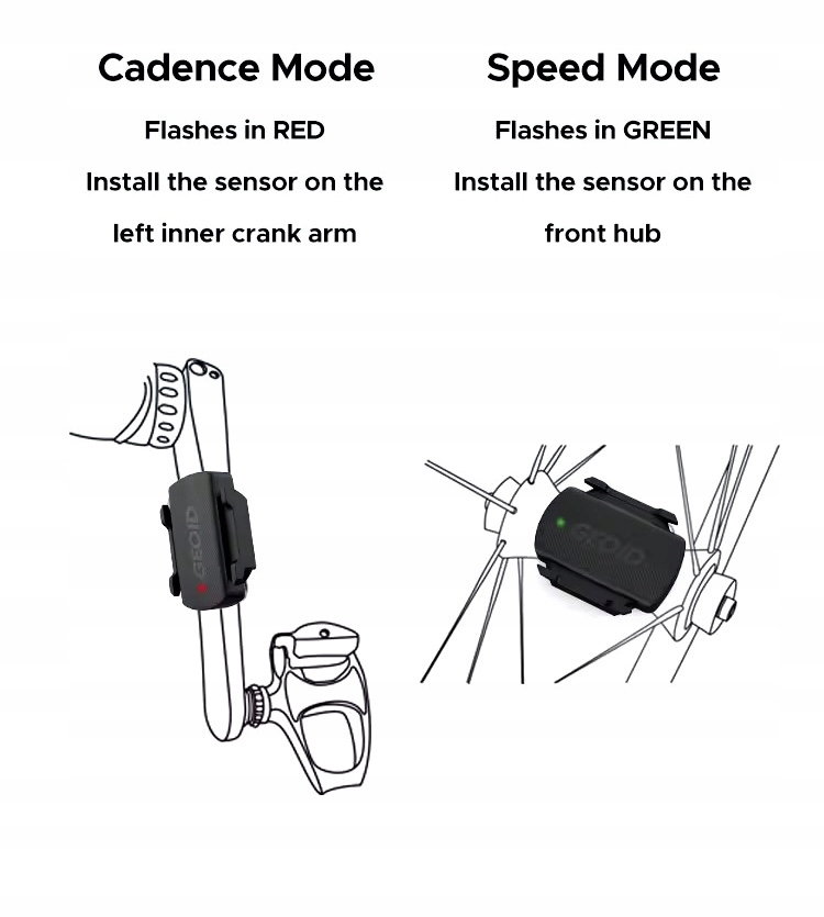 Для перемикання між режимом швидкості та частотою педалювання просто поставте акумулятор знову. Датчик швидкості встановлений на вузлі кожного велосипеда, а датчик частоти педалювання, надаючи точні дані, може бути легко прикріплений до колінчастого вала велосипеда. Примітка. Датчик може вибирати лише один режим одночасно (швидкість або частота педалювання).