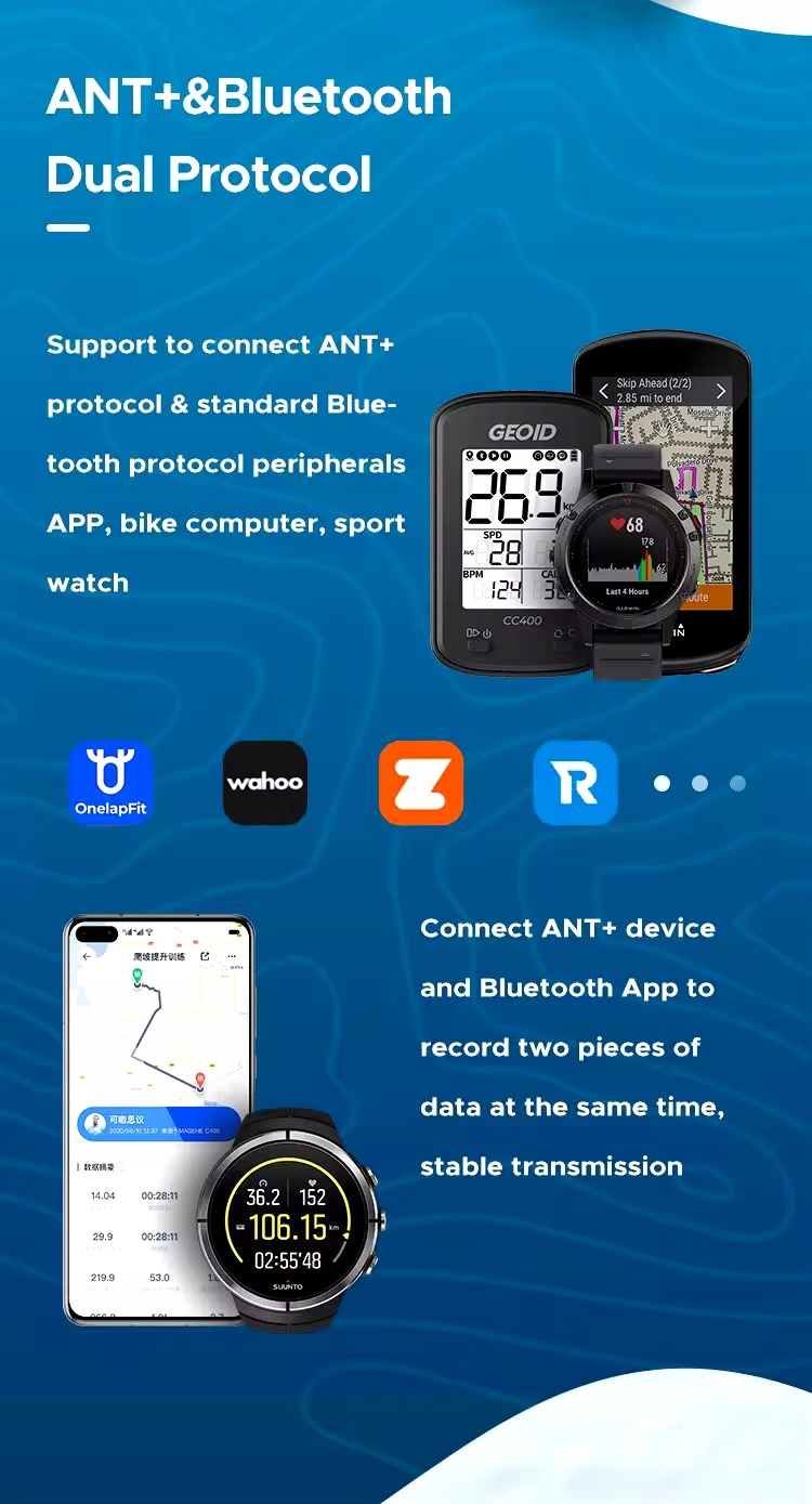 пристрій ant+ записує дані одночасно за допомогою спортивного додатка. Geoid CS600 може підключити велосипедний комп'ютер Ant+, дивитися та застосувати, щоб ви могли відображати та ділитися ним по -різному. Термін служби акумулятора становить 400 год - 500 год , режим енергозбереження буде автоматично зміщуватися, коли датчик не виявляє руху для 10 секунд , а також автоматично прокидається і передає дані після 3 секунд руху .
