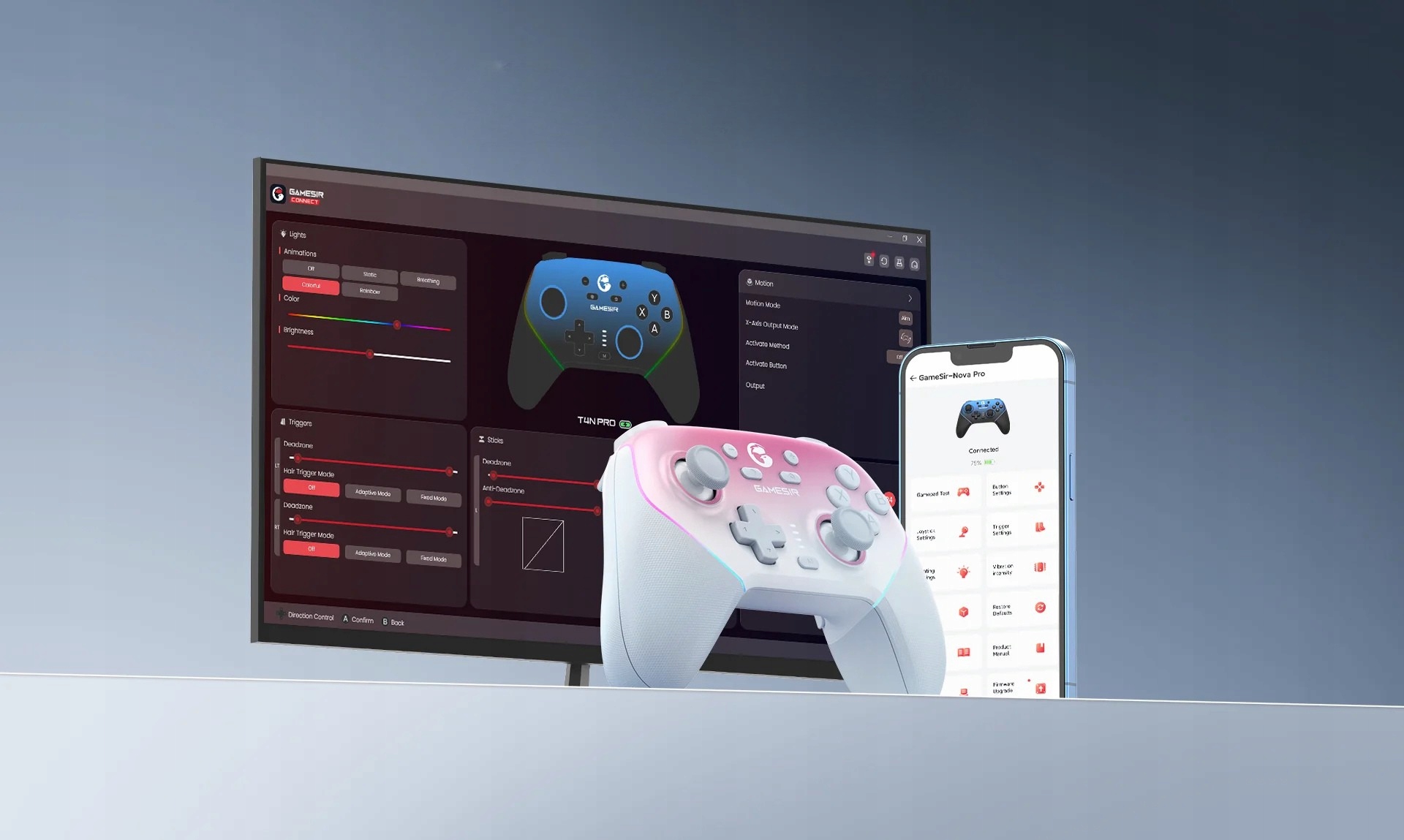 Контролер GameSir Super Nova працює з додатком GameSir, доступним як для ПК, так і для смартфонів з Android та iOS. Завдяки ньому можна налаштовувати роботу кнопок, програмуватимакроси, змінюватиефекти підсвічування, RGBі налаштовувати рівні чутливості стиків і тригерів. Інтуїтивно зрозумілий інтерфейс дозволяє легко зберігати різні профілі користувачів - напр. окремо для FPS, гонок або платформерів - і перемикайте їх залежно від гри. Це розширений командний центр, який дає вам повний контроль над усіма аспектами роботи контролера.