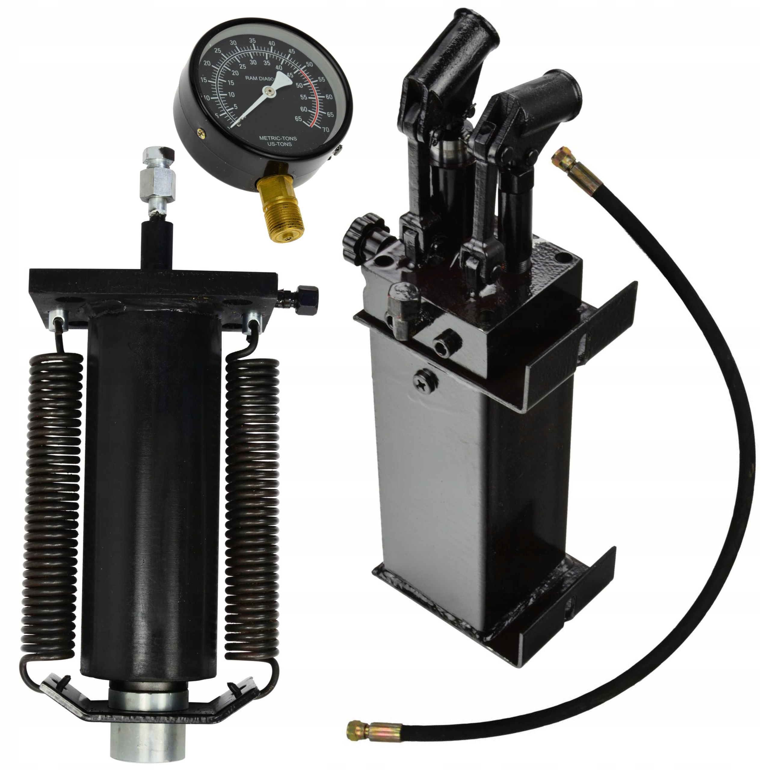 Набір для преса 50T складається з приводу, двоступінчастого насоса, який дозволяє точно дозувати зусилля, манометра з градуюванням в тоннах і гідравлічних шлангів довжиною 620 мм і 920 мм.