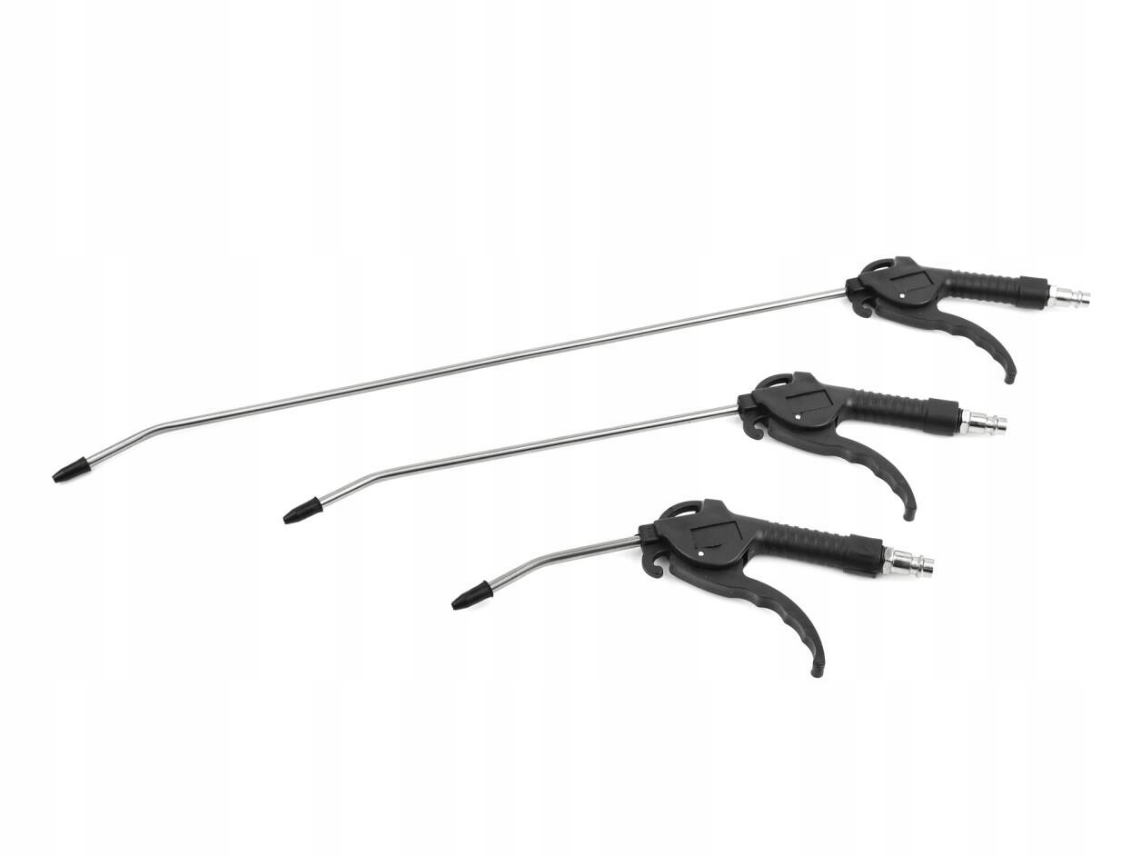 Комплект видування, що складається з 3 пістолетів з насадками довжиною 100/300/500 мм. Особливо корисний при прибиранні важкодоступних місць. Насадки оброблені гумовими ковпачками. Оснащений стандартним повітряним підключенням 1/4 дюйма.