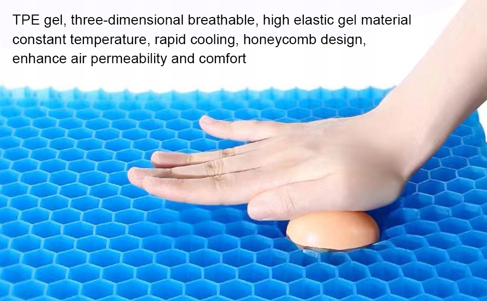 Насолоджуйтесь охолодженням】 Наша подушка для сидіння виготовлена з густого гелю з стільниковою конструкцією, що збільшує потік повітря, забезпечуючи найвищий комфорт охолодження, запобігає пітливню сидіння і провітрює сітчасту кришку, яка, на відміну від моделі з піною з формою, не нагріває. Ідеально підходить для людей, які довго сидять.