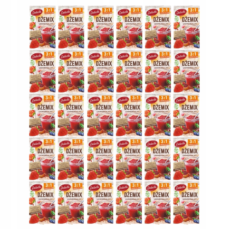 dżemix 3: 1 Delecta - це гелінг -суміш для приготування домашніх джемів і варення з 1 кг фруктів і 330 г цукру. Ідеально підходить для полуниці, малини, вишні, ягід та інших літніх фруктів. Полегшує отримання відповідної узгодженості консервів. Просто змішайте фрукти з джамікс, кип’ятіть, додайте цукор і варіть 2 хвилини. Після зняття піни передайте на банки. Простий спосіб тримати мухи ароматів довше. Завдяки Dżemix, підготовка консервів швидка, легка і завжди досягає успіху.