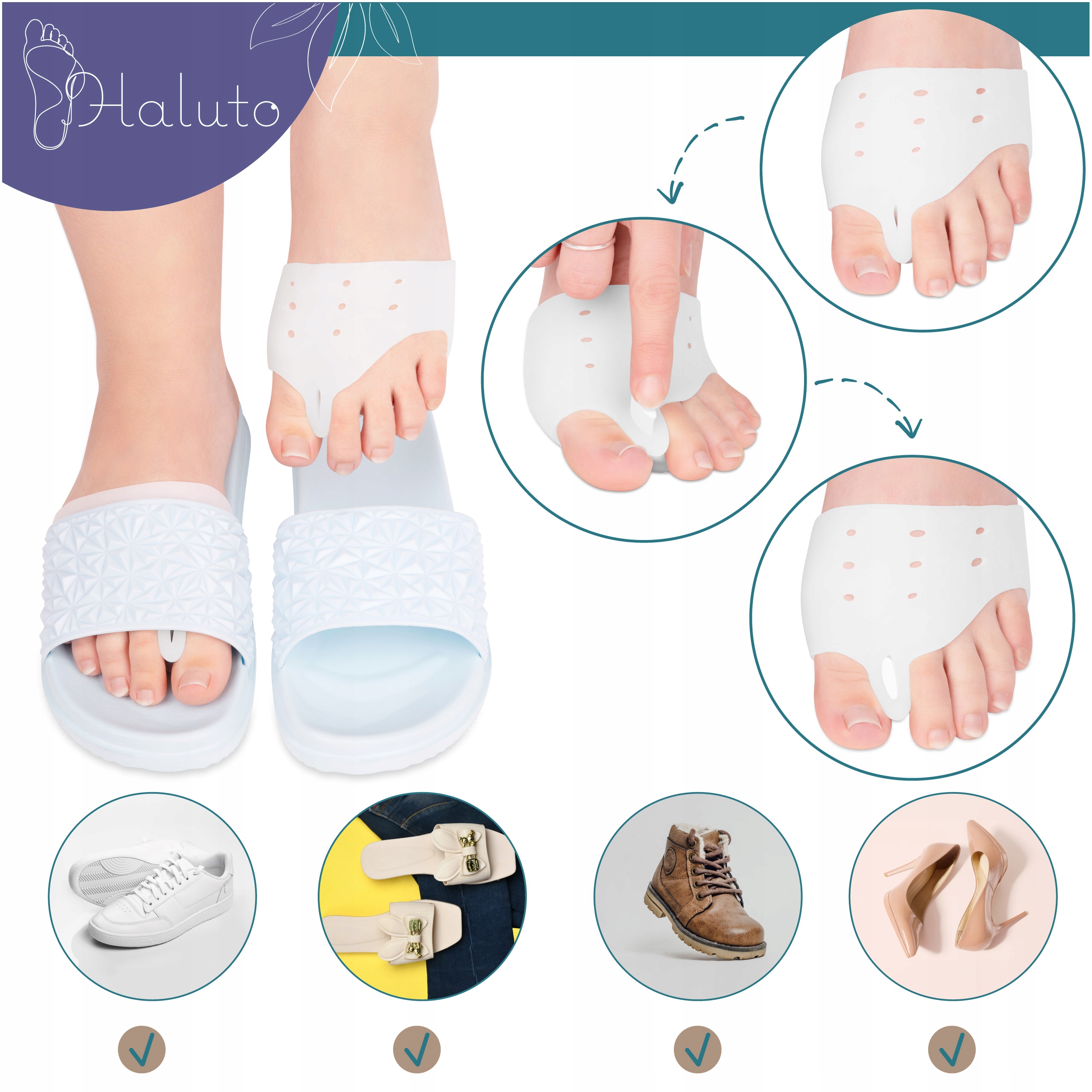 Розділювач можна носити цілий день, а надівши його на ногу, ви практично не відчуваєте його присутності. М'який і гнучкий силікон легко прилягає до стопи, що дозволяє носити його з різним типом взуття. Одягнувши взуття, ви можете практично забути про його існування.