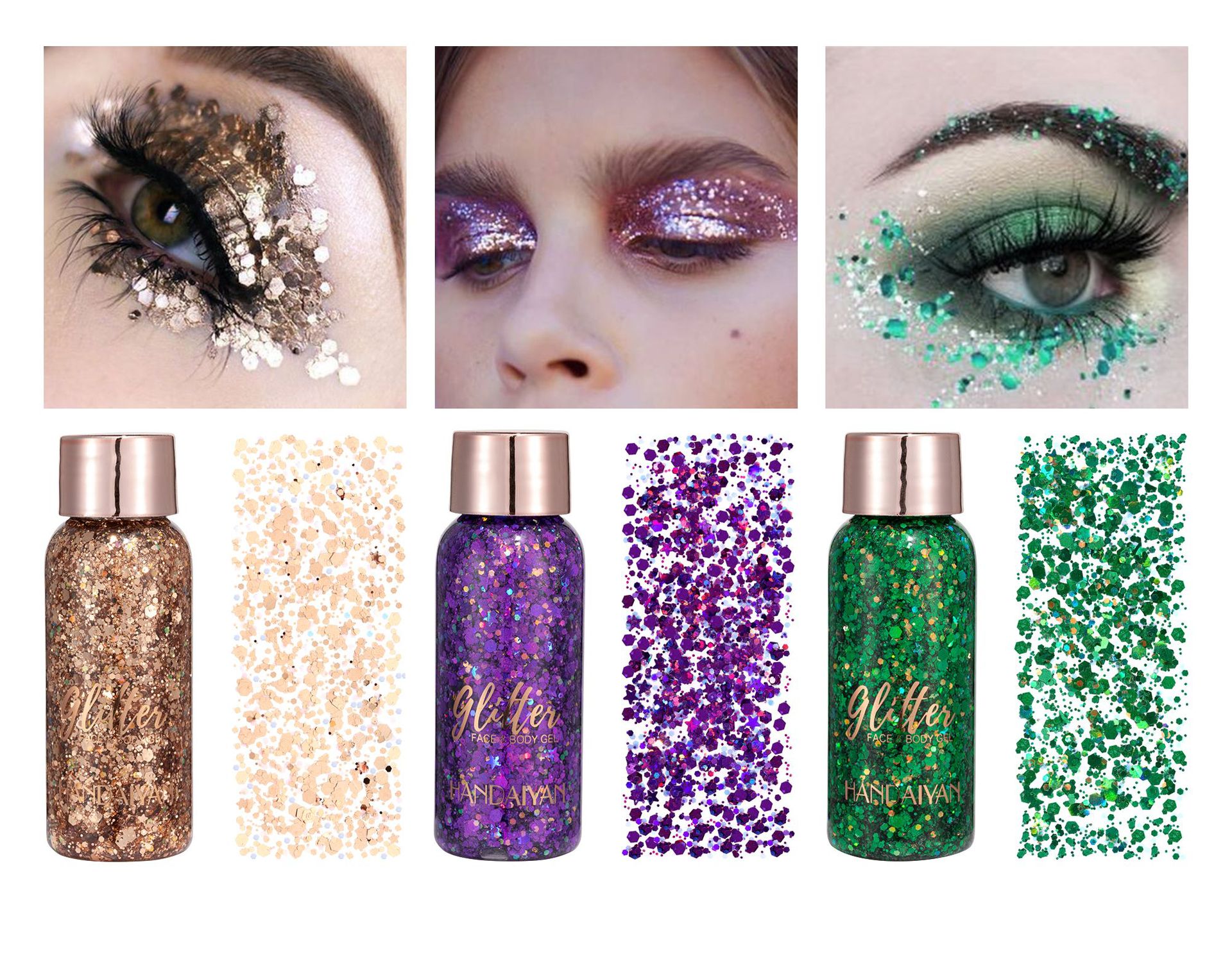 - Гель може бути зручнішим для застосування макіяжу. Глоцати знаходяться у формі зірок, місяців та шестикутних блискітків, які дуже блискучі та мерехтливі з відтінком, залежно від огляду, завдяки якому ваш макіяж є більш привабливим і приваблює очі водонепроникності, а також має легку функцію видалення. Голографічний гель, укладений сиренами, безпечно носити на шкірі.