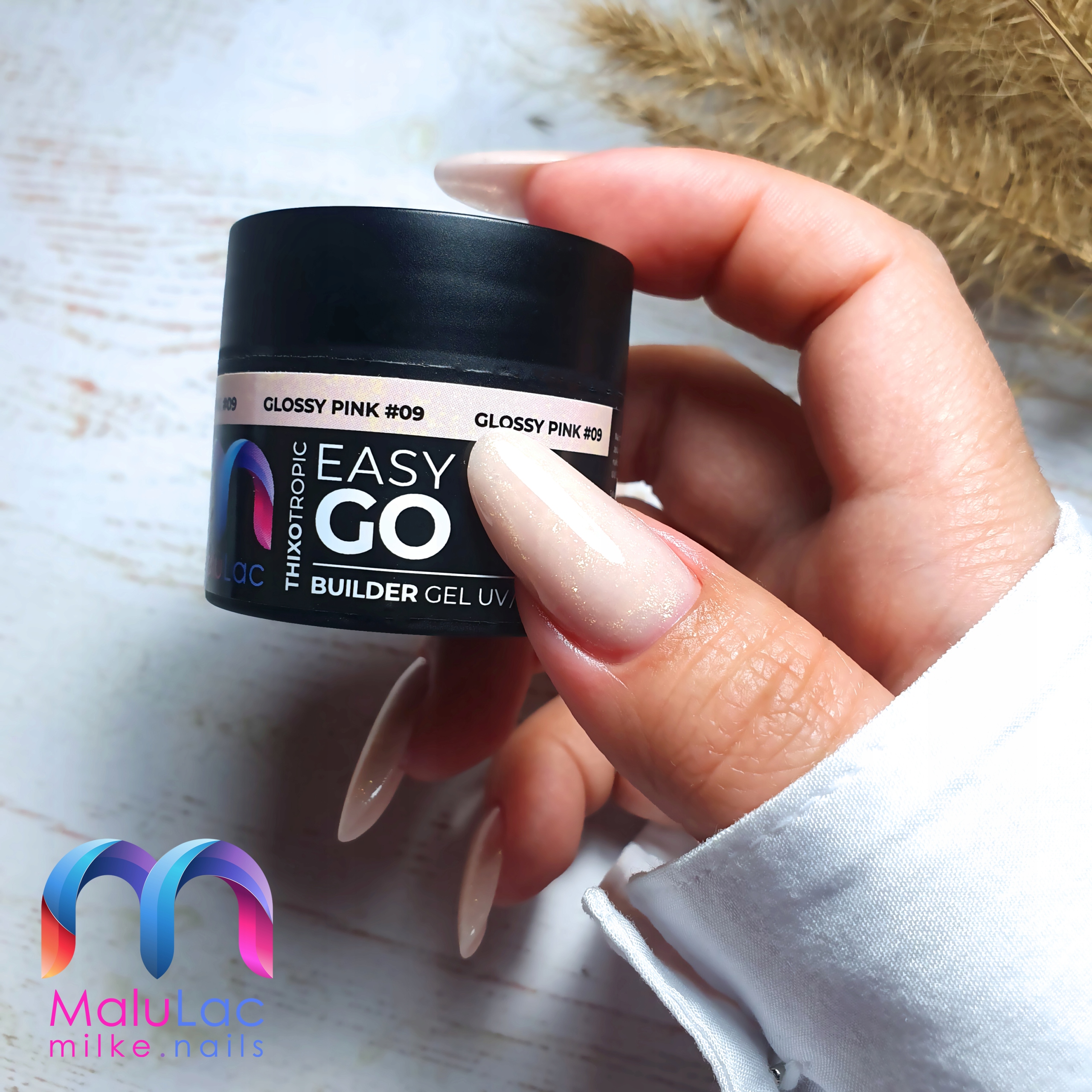 easygo -це багатоповерховий, самостійний будівельний гель з високим входом. застосувати, а після затвердіння в ліхтувальній лампі - стійкий до пошкодження. Його унікальні властивості дозволяють швидке та зручне створення дуже привабливо, і перш за все постійне стилізацію. Затвердіння натуральної пластини та розгинання нігтів