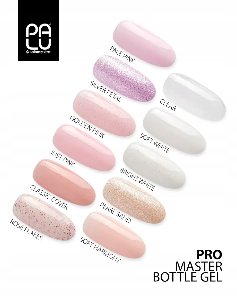 Pro Master Bottle Gel -це кислотний гель у пляшці пензля, створений для підвищення комфорту та ефективності роботи стиліста на всіх рівнях навичок . Консистенція середнього -Dense та властивості самостійних змін дозволяють максимально скоротити час стилю та працювати в " гель без розпилення ". Pro Master Bottle Gel середній твердий, що змушує працювати з натуральною пластиною для нігтів без використання основи. Точно відповідна гель -в'язкість змушує гель добре йти з пензля і легко нанести. Після затвердіння гель має липкий шар гальмування. У своїй будівництві він містить клейові речовини та промотор адгезії, , які збільшують адгезію до природної пластини для нігтів, та будівельних речовин .