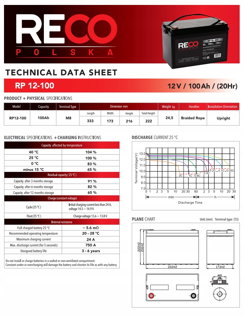 Акумулятор RECO RP12-100 – це акумулятор, виготовлений за технологією AGM VRLA і характеризується внутрішня структура на основі сепараторів зі скловолокна. Сепаратори розміщені між свинцевими пластинами всередині резервуара для зберігання енергії в акумуляторі.