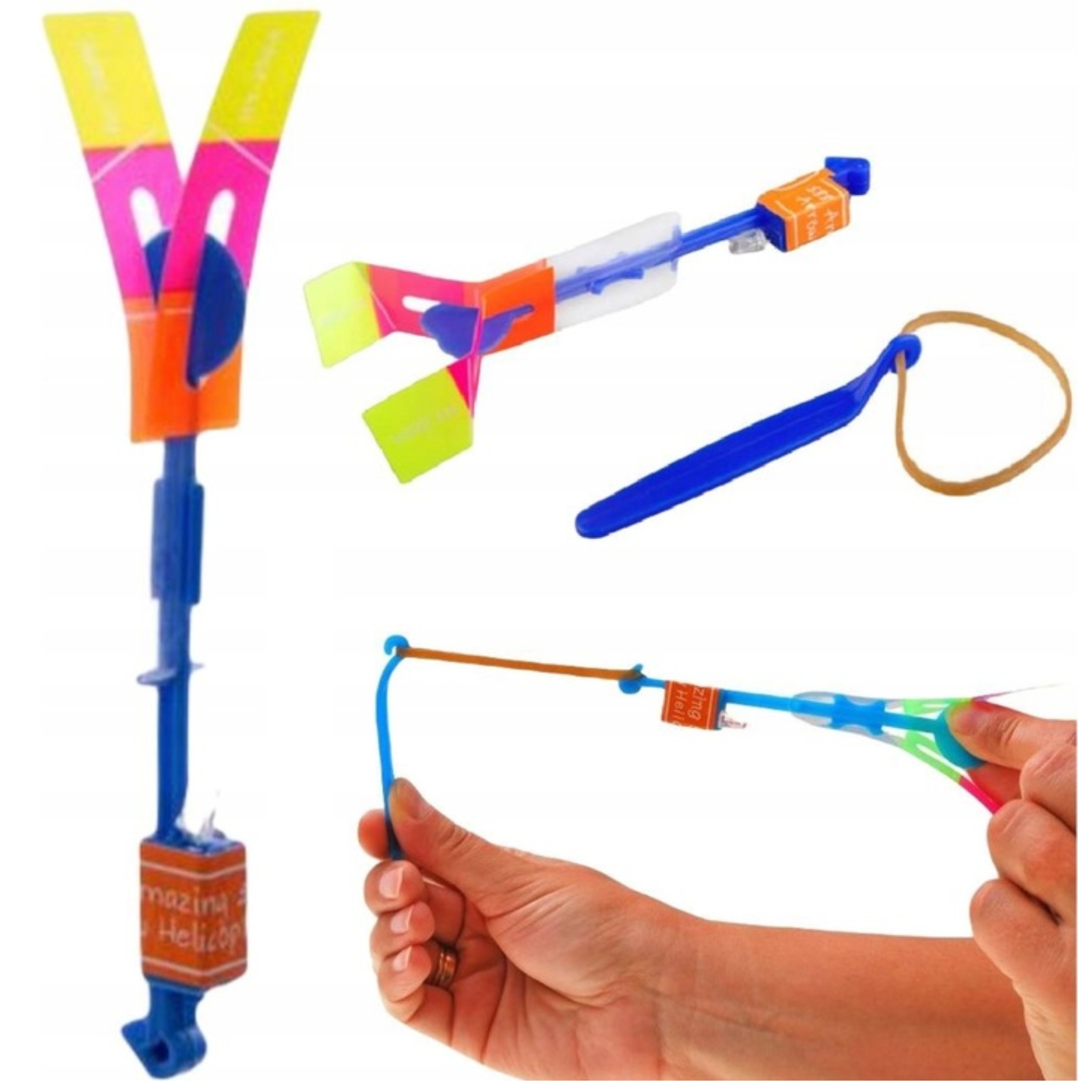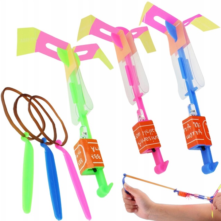 Світлодіодний вітряк (вертоліт) з пусковою установкою. Після пострілу вгору перетворюється на стрілу, яка летить на кілька метрів угору. Він опускається яквертоліт завдяки складному гвинту - він повільно падає на землю. Дивовижні світлові ефекти в простій іграшці!