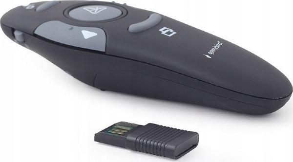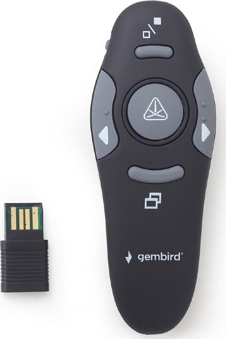 Бездротове дистанційне керування для презентацій PowerPoint. Червона лазерна вказівка, щоб виділити деталі презентації для глядачів. 4 кнопки для керування найбільш часто використовуваними функціями презентацій PowerPoint: наступний/попередній слайд, увімкнення/вимкнення екрана, показ/відновлення презентації, увімкнення/вимкнення лазера. Практичний вимикач живлення. Plug & Play, програмне забезпечення не потрібне.