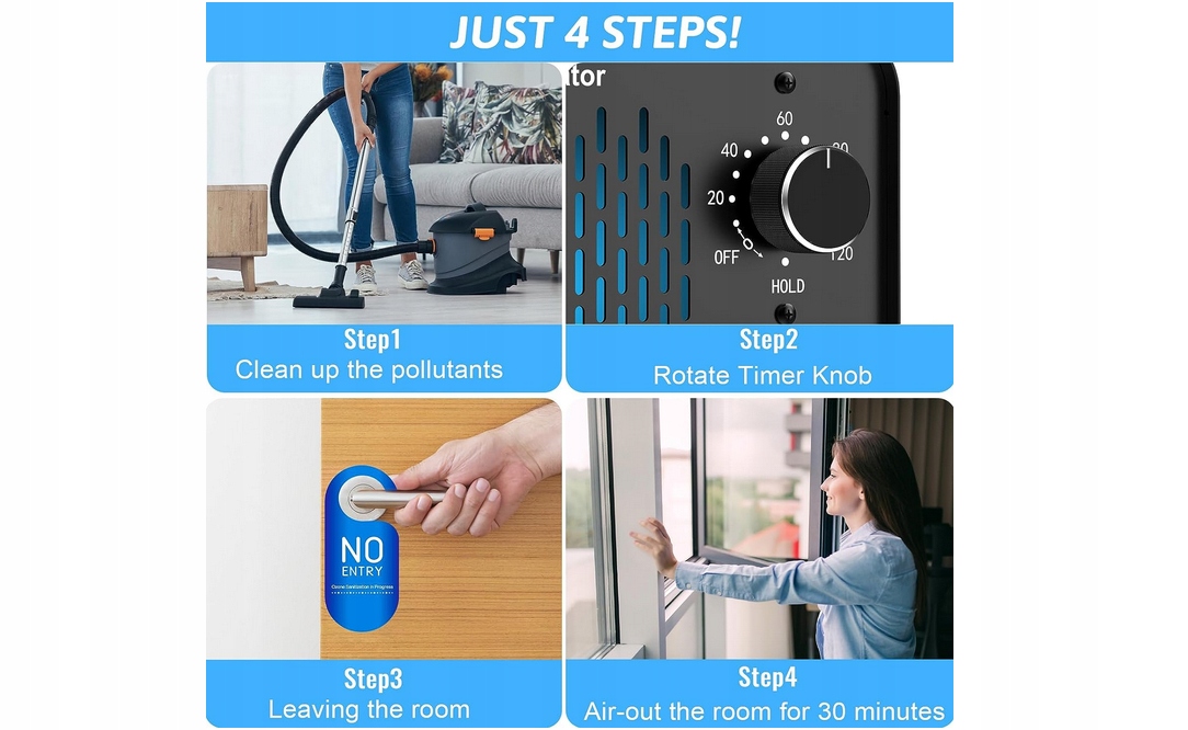 ЛЕГКИЙ У ВИКОРИСТОВУВАННІ: Просто поверніть ручку таймера машини для озонування повітря, щоб встановити час виробництва озону, і вийдіть з кімнати, ці запахи будуть нейтралізовані, залишаючи чисте та ароматне середовище. Генератор озону автоматично припинить роботу після закінчення зазначеного часу. Після припинення вироблення озону провітрюйте принаймні 30 хвилин.