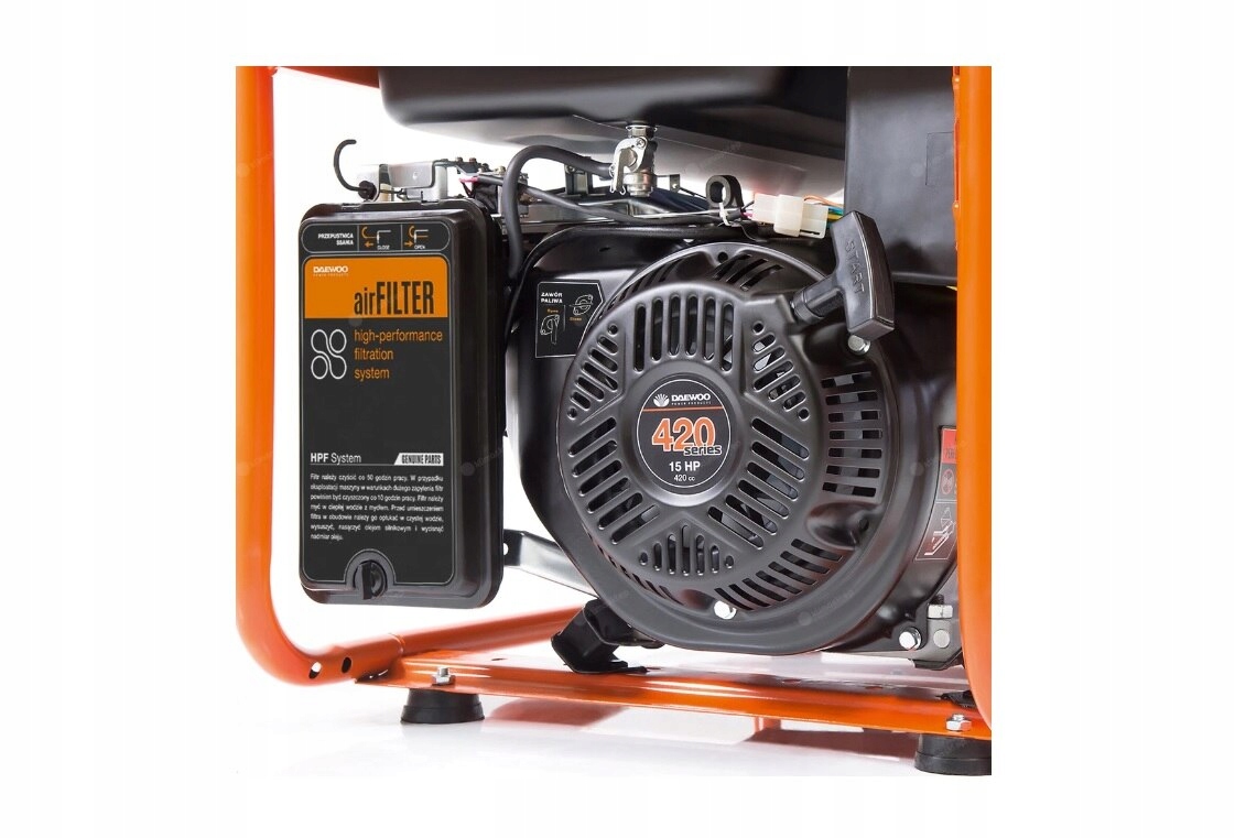 Двигун генераторної установки DAEWOO GDA7500DPE-3 (6,5/6,0 кВт - 380В, 6,5/6,0 кВт - 230В, 420см3, 15 к.с., 30л, 1x230V, 1x380V, 1x12V, 86,9 кг, ATS) використовує генератори з мідні обмотки, які виробляють струм номінальною потужністю 6,0 кВт і максимальною потужністю 6,5 кВт. Завдяки інноваційній технології подвійного живлення однакова потужність виробляється в операційних системах 230 В і 400 В, які вибираються окремим перемикачем.