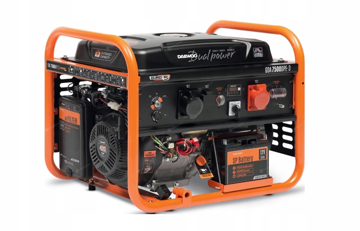 Контролер AVR відповідає за стабільність напруги. Завдяки збільшеному 30-літровому паливному баку пристрій працює до 17 годин при 50% заряді. Генератор DAEWOO GDA7500DPE-3 (6,5/6,0 кВт - 380В, 6,5/6,0 кВт - 230В, 420см3, 15 л. с., 30л, 1х230В, 1х380В, 1х12В, 86,9 кг, ATS) розетки 230 В (1х 16 шт.) A та 1x 32 A) та один 400 V 16 A. Пристрій має багатофункціональний дисплей 3-в-1 (напруга, частота струму та робота двигуна), захист від перевантаження та індикатор низького рівня масла.