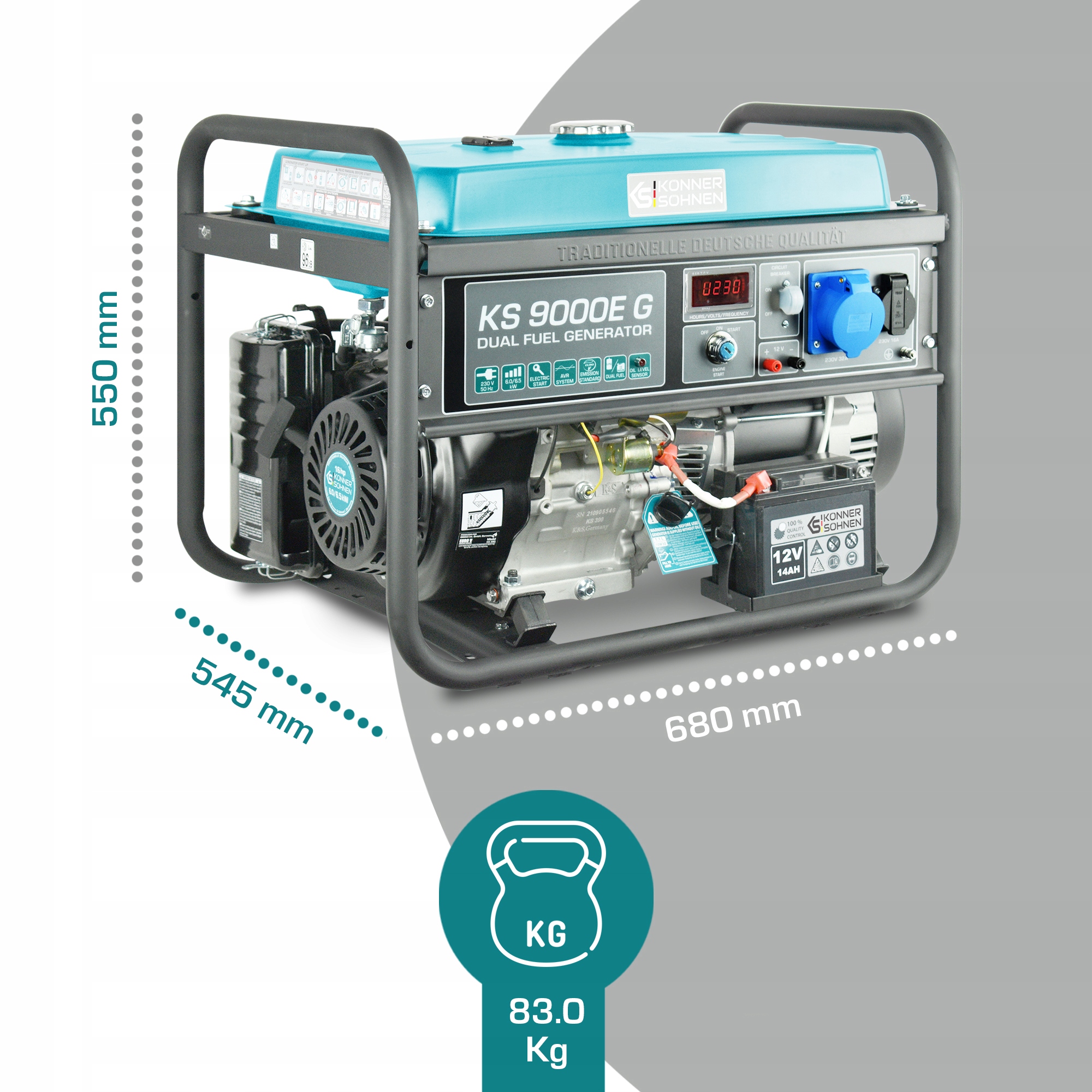 Газ-бензиновий генератор KS 9000E G від німецького бренду Könner&Söhnen серії DUAL FUEL (LPG / Petrol) є двопаливним гібридом модель, яка користується попитом, оскільки має оптимальні властивості, оснащена як ручним, так і електрозапуском. Потужності генератора достатньо для забезпечення аварійного живлення постійно використовуваних електроприладів. Генератор однаково ефективний як на бензині, так і на газі (пропан-бутан) - параметри виробленої електроенергії будуть однакові. Все необхідне для підключення газового балона вже є в комплекті: