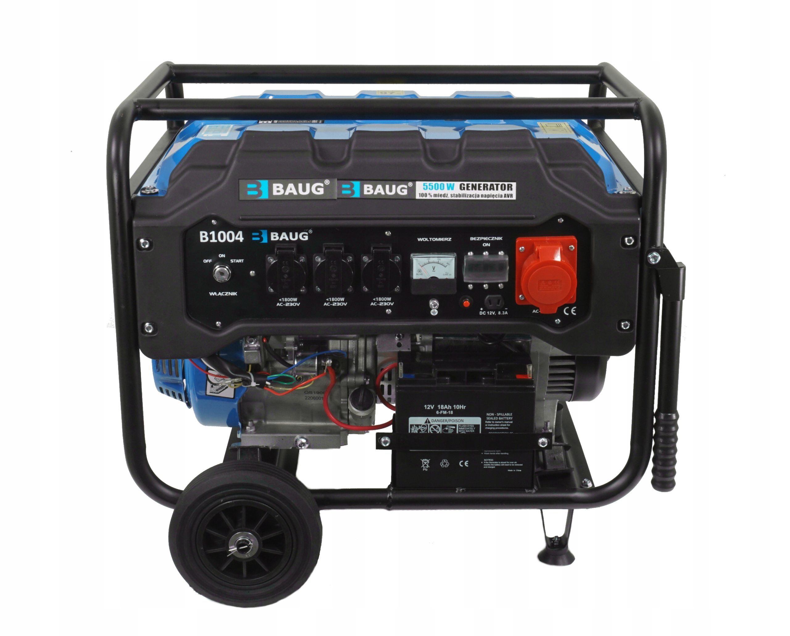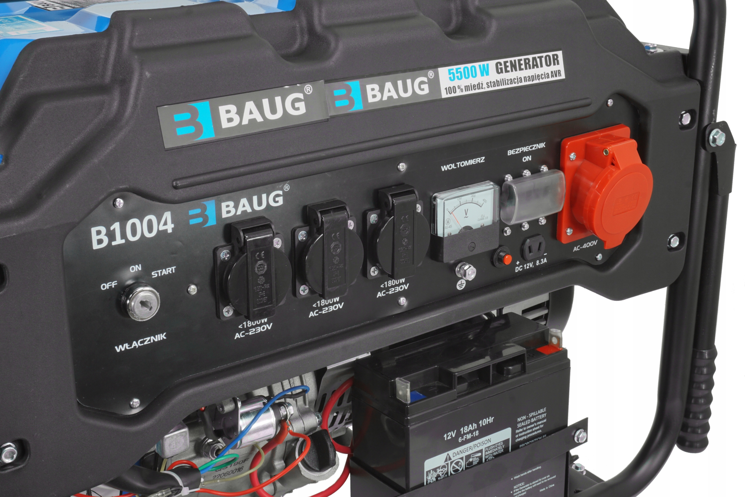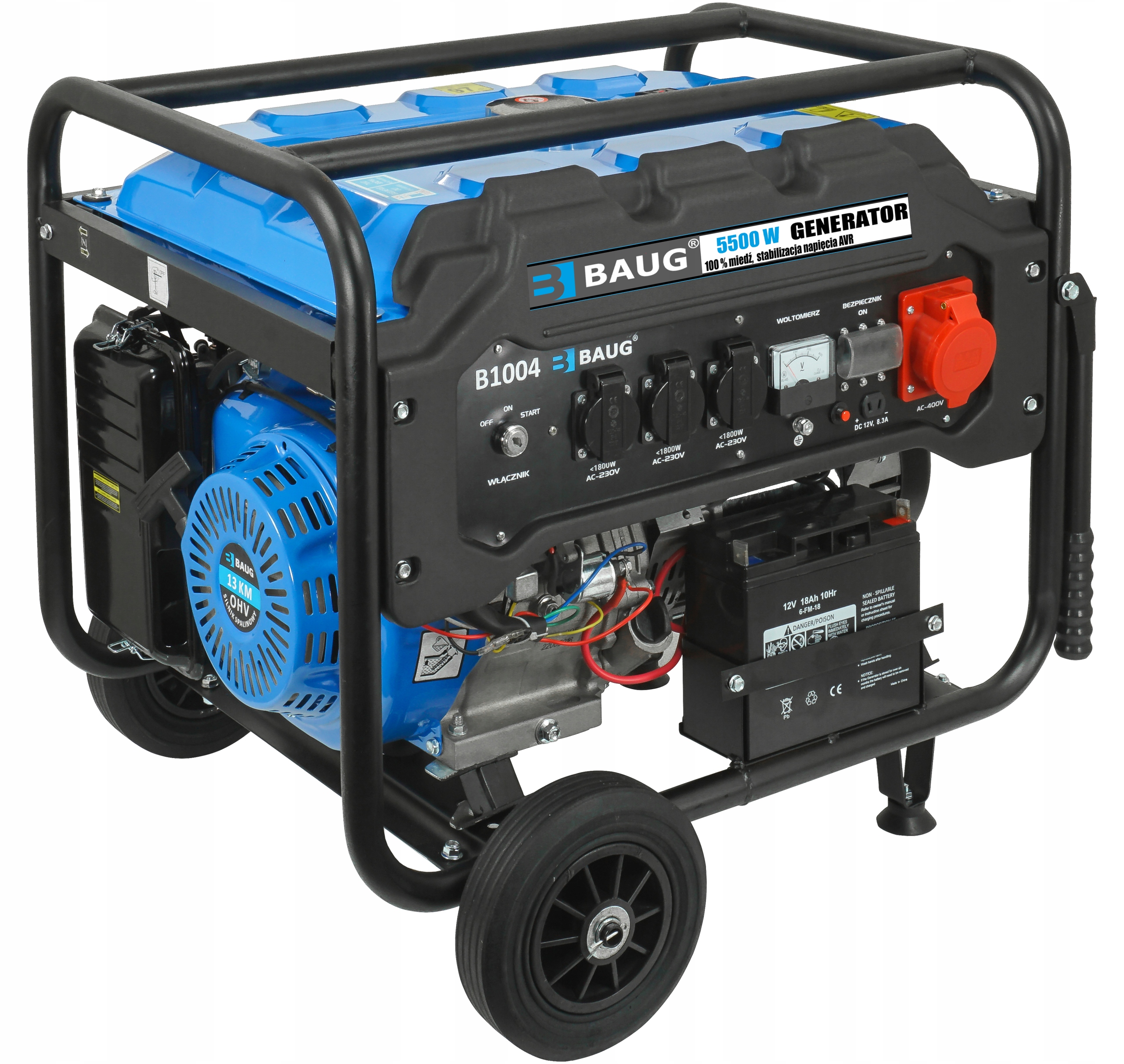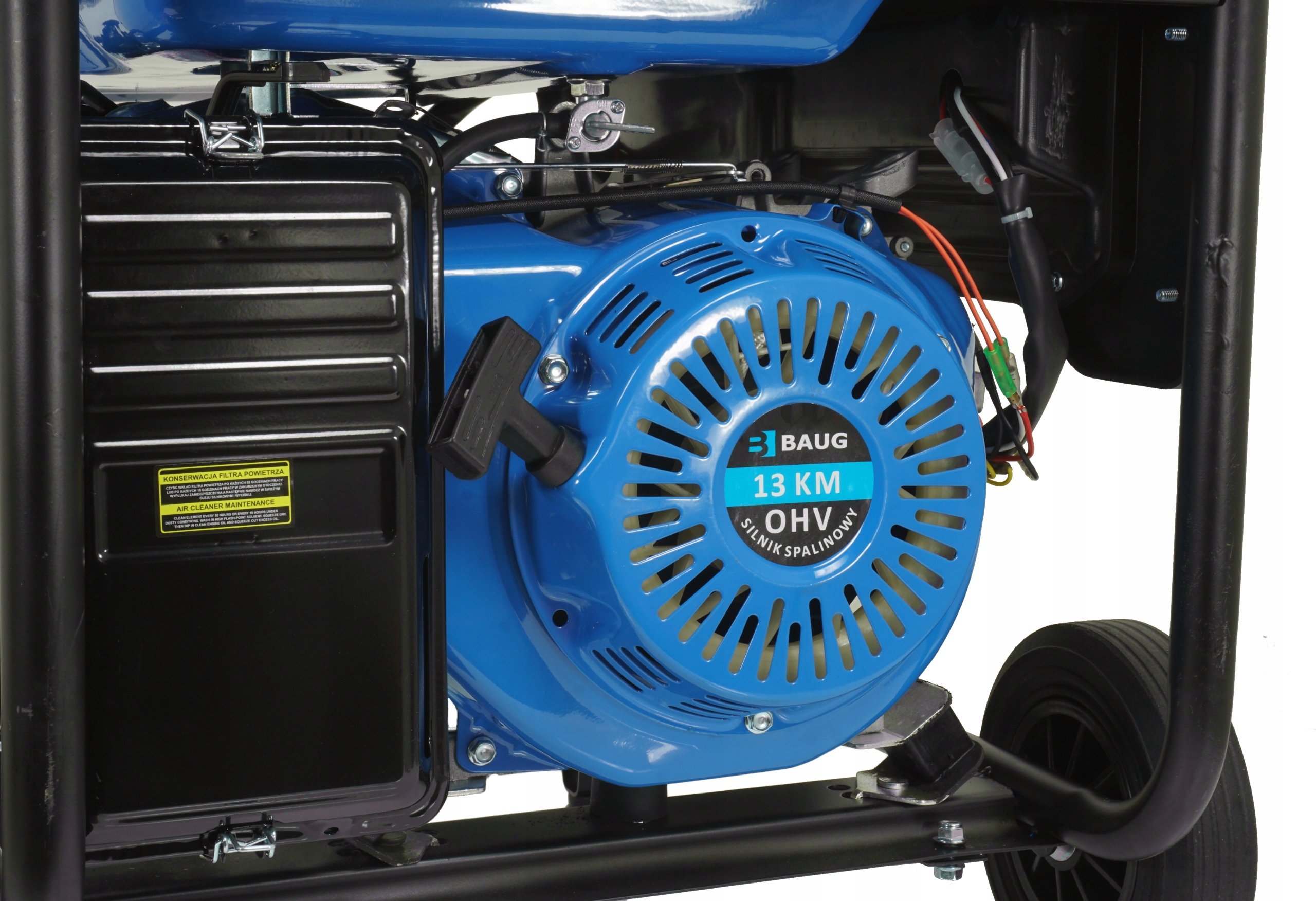 Генератор BAUG працює від чотиритактного двигуна потужністю 13 HP. Генератор є самостійним джерелом електроенергії скрізь, де немає доступу до електроенергії. Відмінно підійде для будь-яких будівельних майданчиків, дач, ділянок, кемпінгів або кемпінгів. Також ідеально підходить для живлення печей і насосів центрального опалення. Цей пристрій складається з генератора, що приводиться в дію двигуном внутрішнього згоряння.