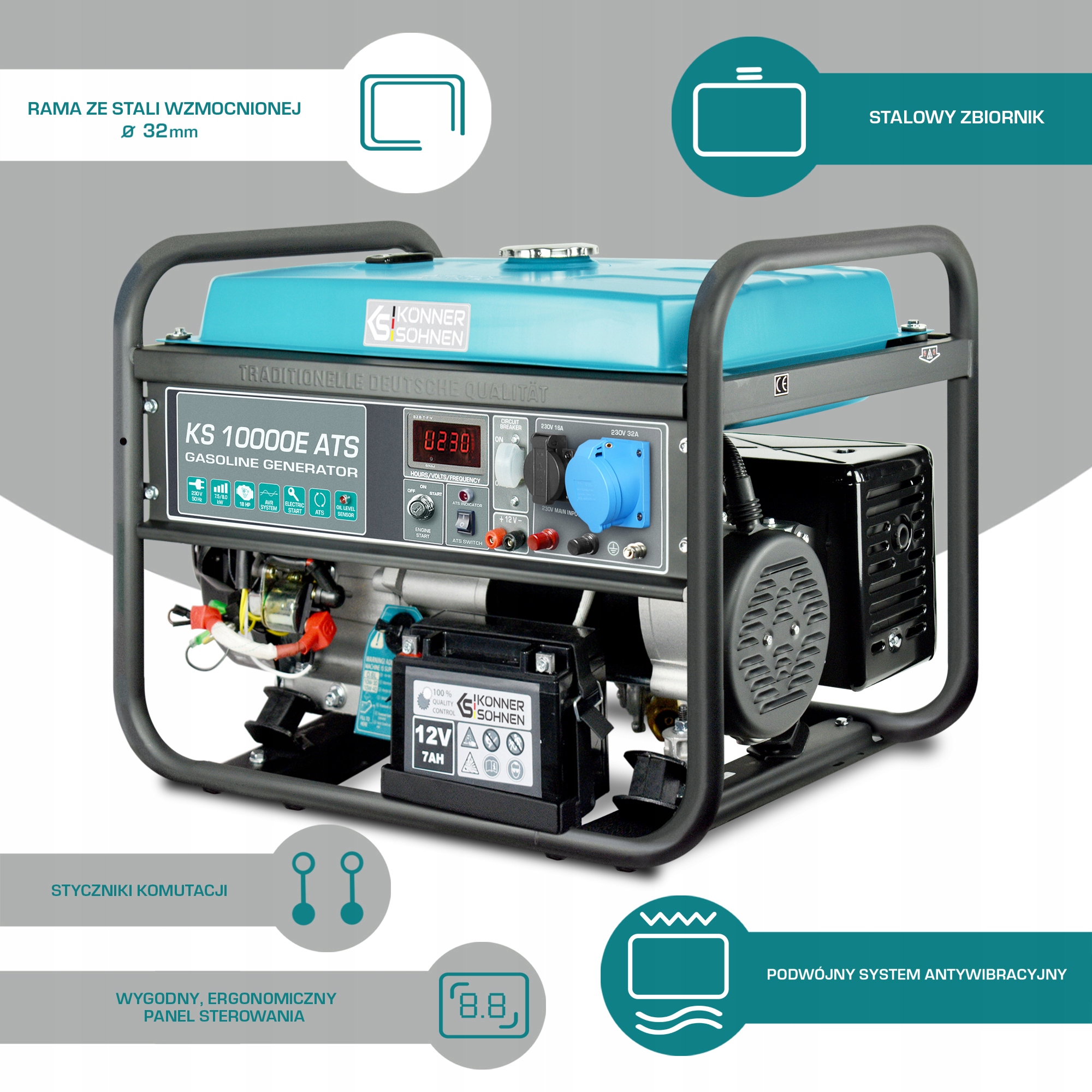 Бензиновий генератор KS 10000E ATS від німецького бренду Könner & Söhnen є чудовим вибором для екстреного або постійного енергопостачання вдома, гаражі, майстерні, фермі тощо побутові. Завдяки потужності та широкому функціоналу його можна використовувати в особистих і комерційних цілях: у сільському господарстві та промисловості, на громадських та дорожніх об’єктах, у будівництві та пожежній охороні. Великий паливний бак забезпечує тривалу безвідмовну роботу. Надійний двигун Könner & Söhnen і високоякісний генератор змінного струму з мідною обмоткою гарантують безвідмовне і тривале використання при максимальному навантаженні. Наявність електронного дисплея дозволяє якісно контролювати роботу генератора і своєчасно проводити технічне обслуговування. А розумний блок контролю якості електроенергії (AVR) і автоматичні вимикачі гарантують безпеку для вас і вашого обладнання. Даний генератор оснащений японським карбюратором, що в поєднанні з потужним і надійним двигуном дозволяє генератору працювати тихіше інших аналогів, надійніше витримувати навантаження, споживати менше палива і бути більш екологічним.