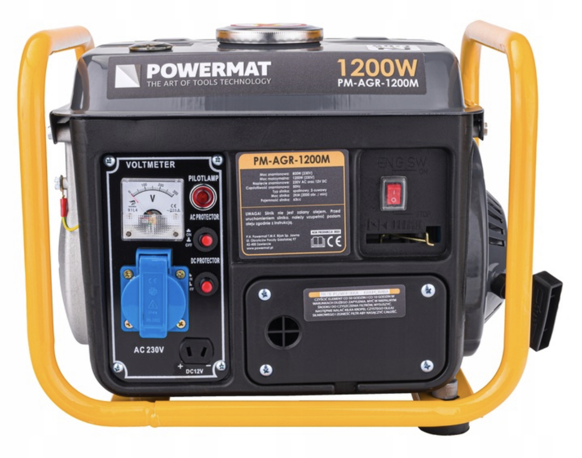 Агрегат генерує змінний струм з напругою 230 В (1 розетка) та 12 В постійного струму (1 розетка). Ідеальне рішення для відсутності електроенергії в полі. Ручний старт - з кабелем. Агрегат, що використовується в ремеслі, будівництві на ділянках та садах для роботи з електроінструментами, насосами, освітленням.