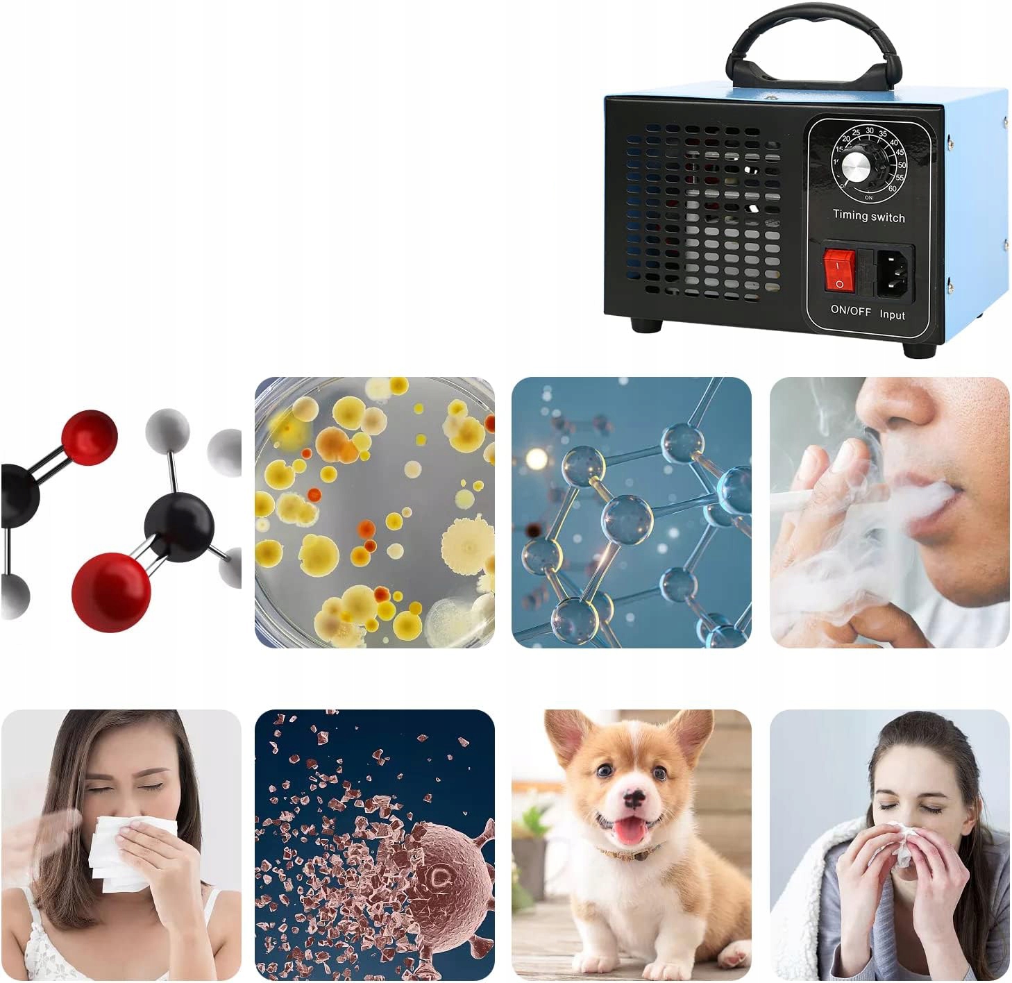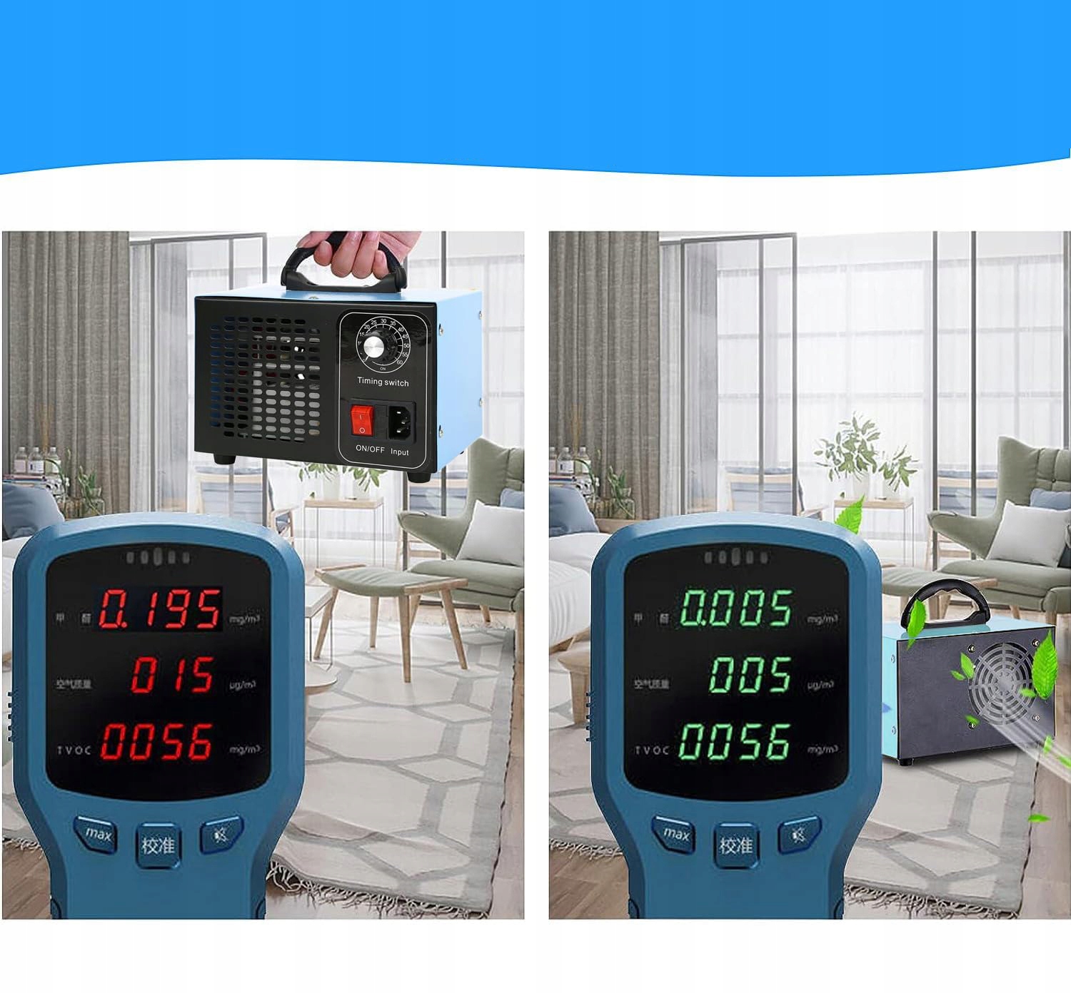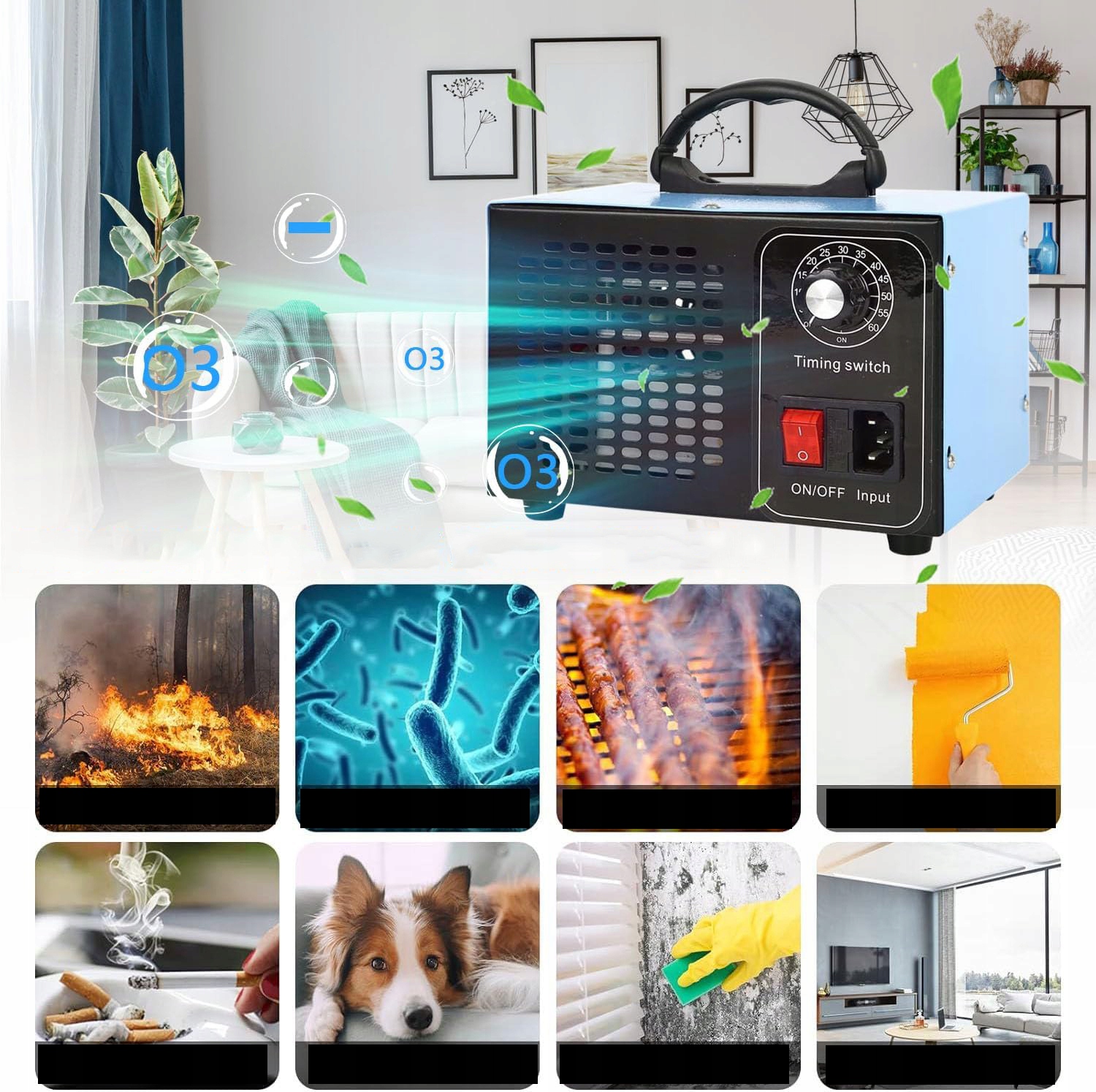 💎💎Ефективний генератор озону -Оновлений озоновий очищувач повітря може виробляти 48 000 мг озону щогодини, площа очищення становить до 300 м². Миттєво виробляє масивний озон, швидко видаляє такі запахи, як запах диму, запах домашніх тварин, запах підвалу, цвіль, запах домашнього декору та інші ЛОС, такі як формальдегід, допомагає видалити та затримати ріст цвілі, зменшує алергени та створює чисте повітря.