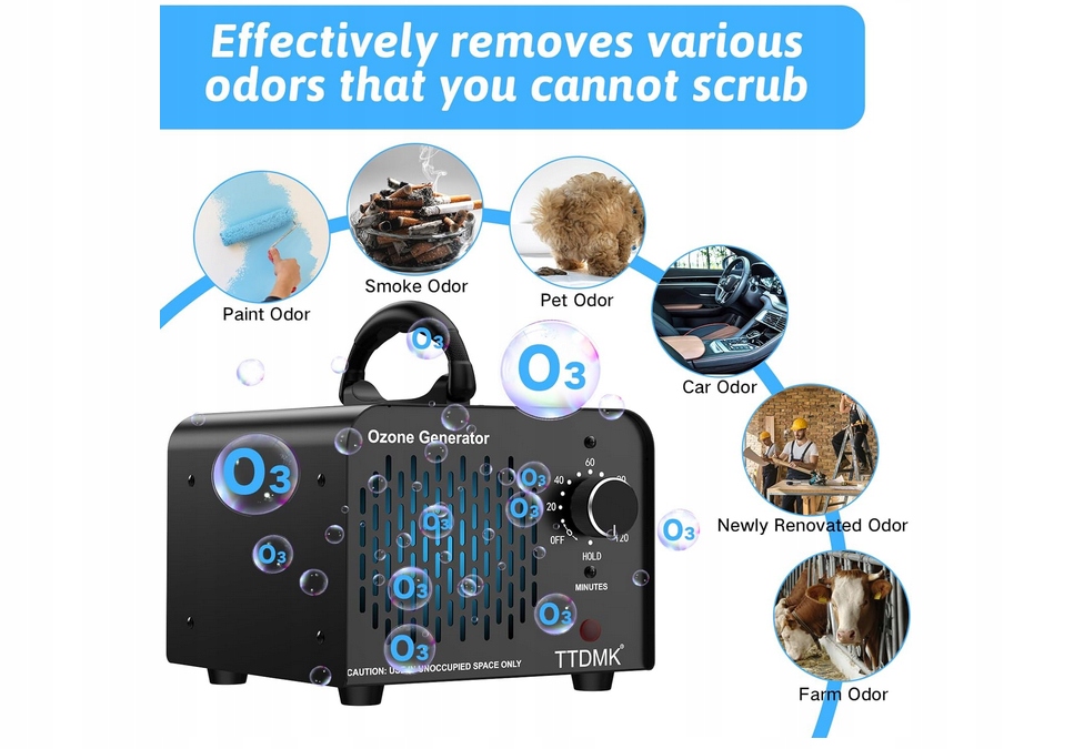 ОБСЛУГОВУВАННЯ: Генератор озону марки TTDMK пропонує зручність адаптації до різноманітних приміщень, ефективно усуваючи стійкі запахи, тим самим покращуючи загальну якість повітря та створюючи приємнішу атмосферу.