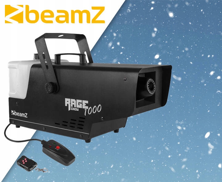 BeamZ RAGE1000 — потужна снігова машина потужністю 1000 Вт, оснащена бездротовим і дротовим пультами дистанційного керування. Машина виробляє дуже гарні пластівці завдяки оновленій зіркоподібній насадці.