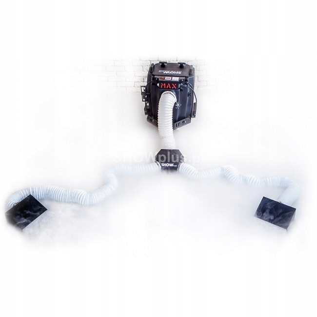 • Система розповсюдження диму Showplus Fog System - це своєрідний подовжувач і дистриб'ютор, за допомогою яких генератори можуть бути розміщені в одному місці, а вивільнення диму відбудеться на відстані 4 м від генератора, і дим буде випущений одночасно в 2 місцях.