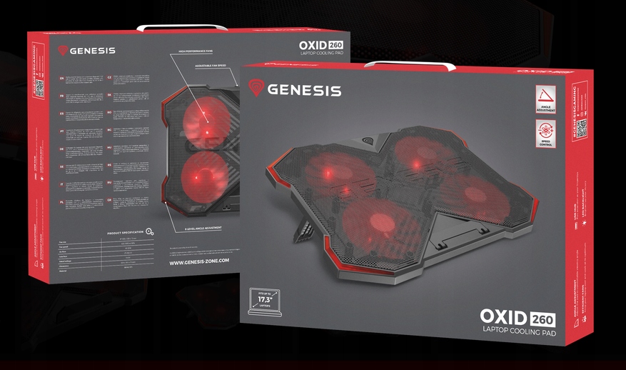 Genesis Oxid 260 була розроблена для ноутбуків з діагональною до 17,3 ". Ефективна циркуляція повітря забезпечується металевою панеллю з дірами на передній частині , а підтримка гуми на основі його захистуть від нещасних комп'ютерів, , що перешкоджає йому, захищаючи від нещасних комп'ютерів. Падіння