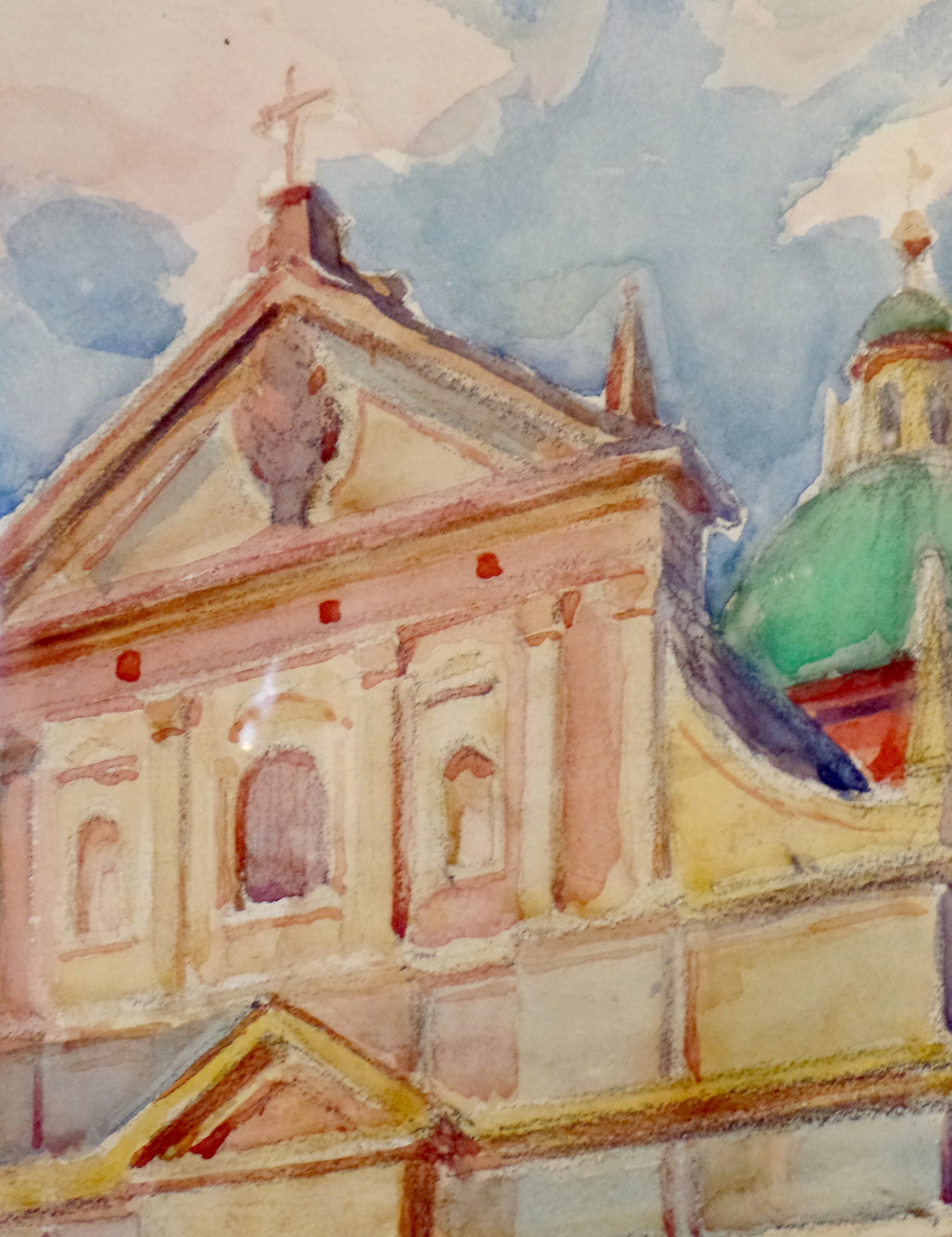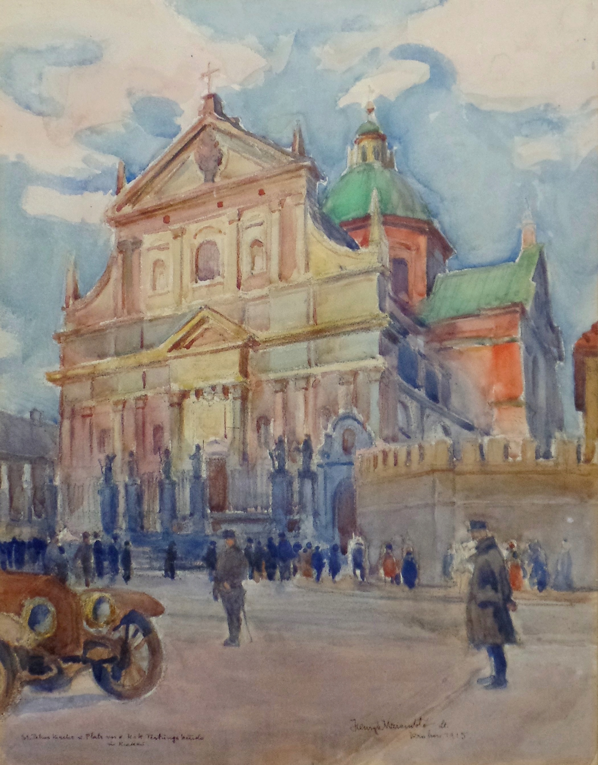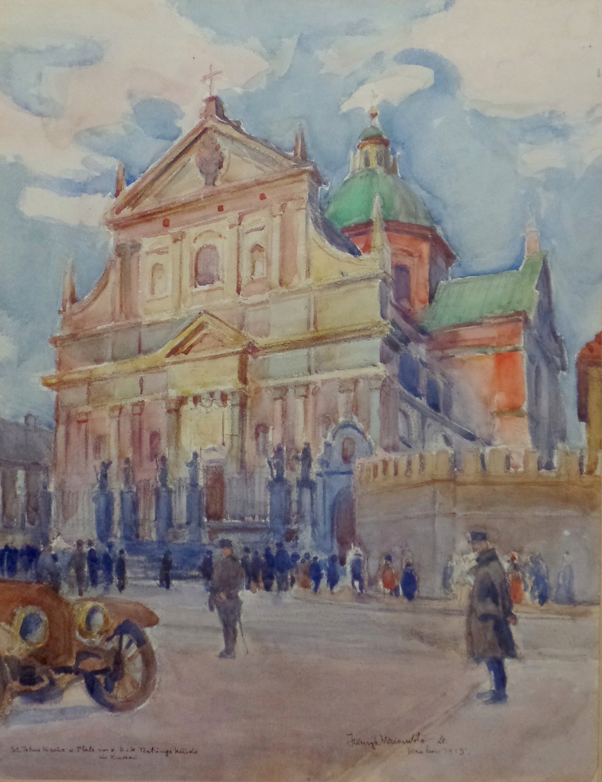 Henryk Uziembło (1879-1949) «Вигляд костелу Св. Петра в Кракові та площі перед штаб-квартирою Краківської фортеці». Намальована акварель на папері, розміри: 44 х 34 см (у паспарту). Опис і підпис пір’їнкою внизу «St.Petrus Kirche u.Platz vor d.K.u.K. Festung Kmando/ in Krakau/HenrykUziembło Lt./Kraków 1915». На реверсі є додатковий опис "LT. HENRYK UZIEMBŁO/MAGDALENEN -/ - PLATZ vor d. KuK. Festungkomando /in Krakau" та фірмова наклейка краківської фабрики R.Jahoda.