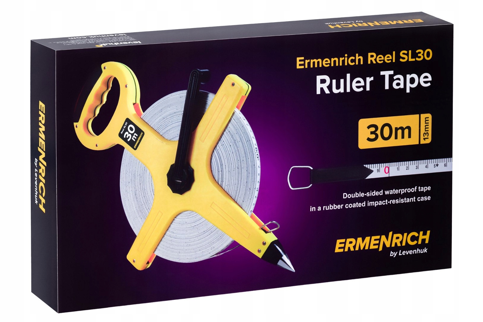 Ermenrich Reel SL30 — це професійна вимірювальна стрічка, також відома як стрічкова лінійка. Цей інструмент особливо корисний у сільській місцевості та при будівельних роботах на відкритому повітрі завдяки гострому шипу для кріплення інструменту в землі. У верхній частині корпусу розташована ергономічна неслизька ручка, що дозволяє міцно тримати інструмент під час роботи.