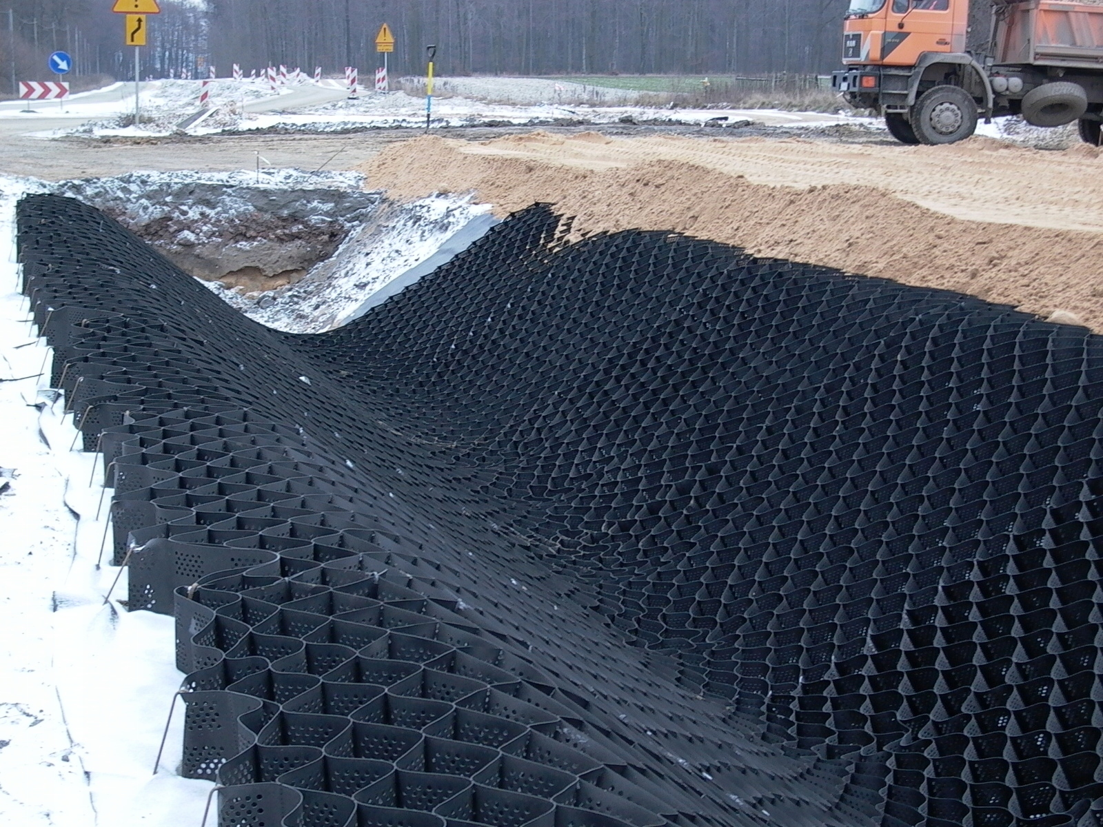 Візуалізація розподілу сил за допомогою стільникової георешітки (cellular geogrid) – операції, подібної до тієї, що відома на снігоступах.